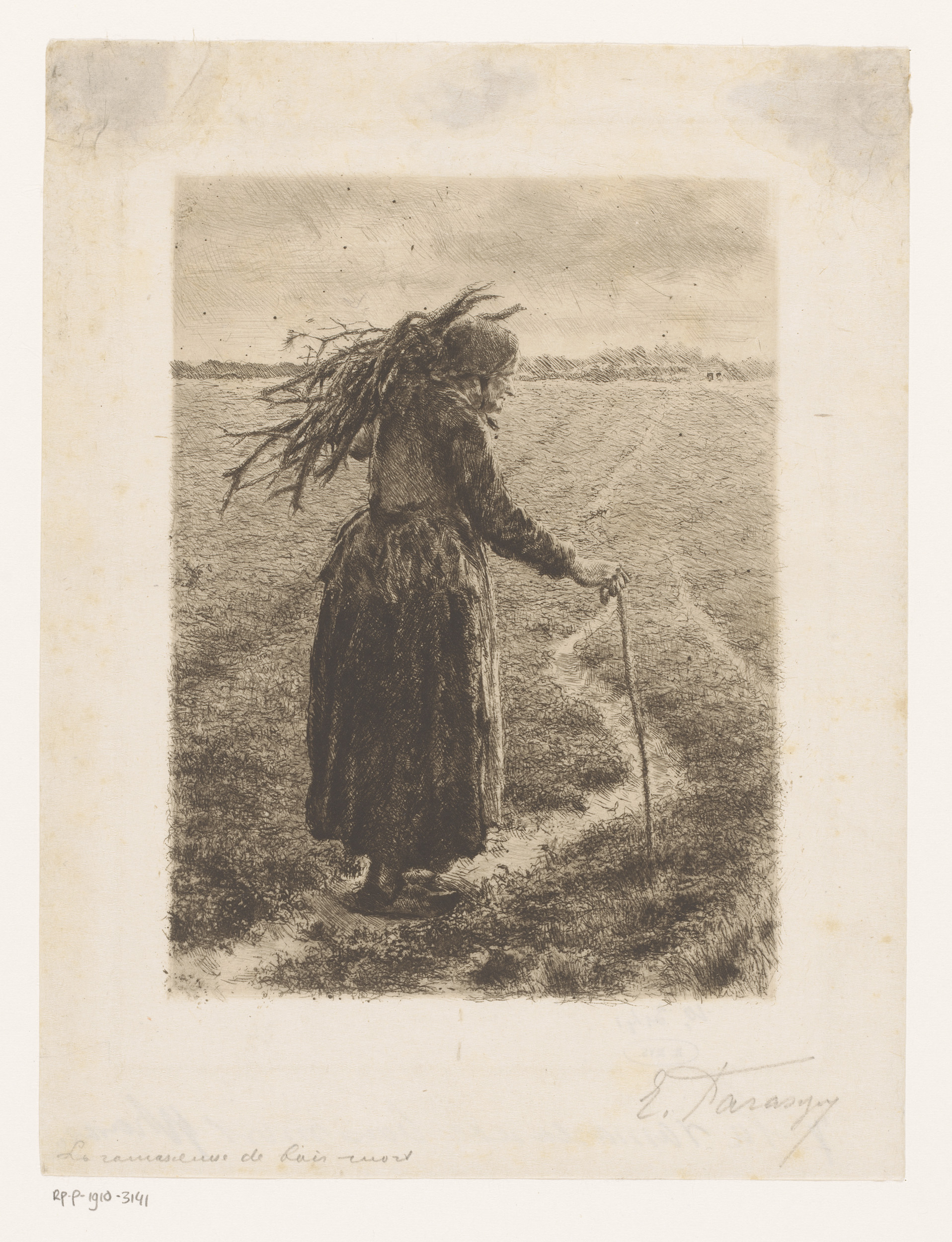 Oude vrouw met wandelstok en takken over de schouder