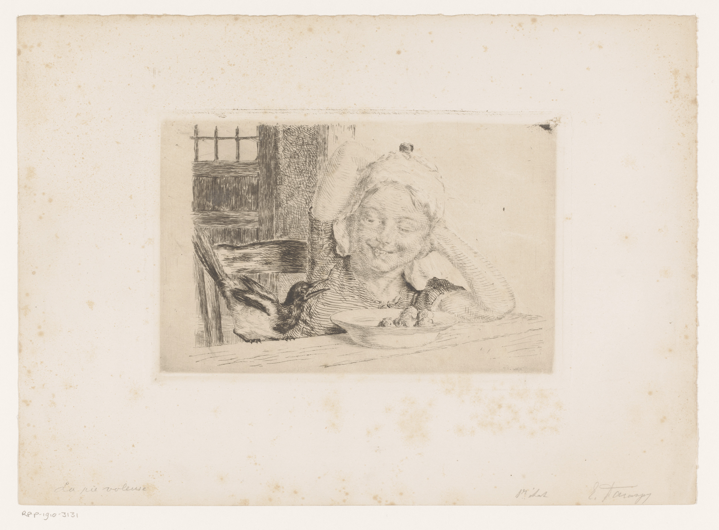 Meisje aan een tafel met een bord eten en een ekster