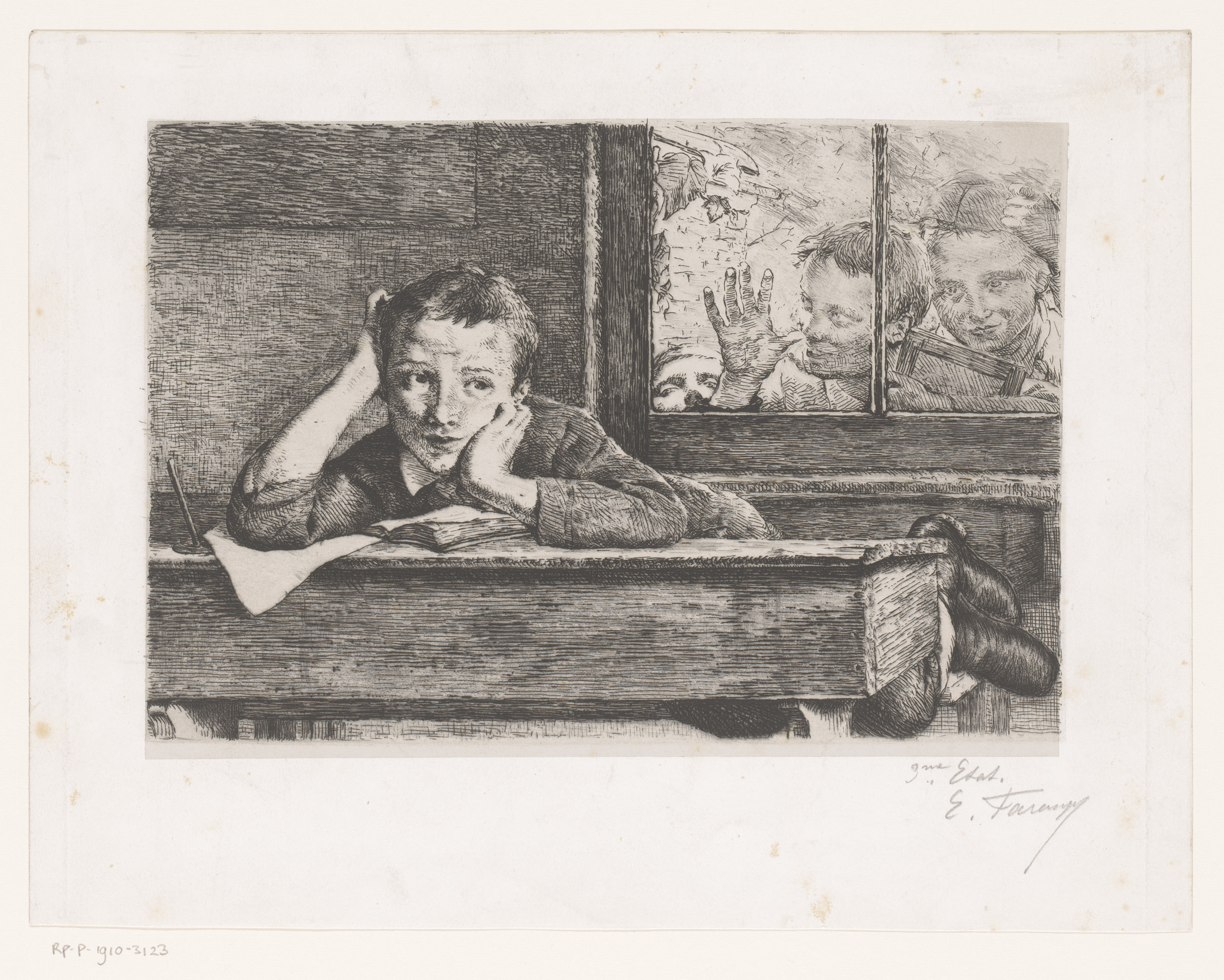 Drie kinderen kijken door een raam naar een jongen d...
