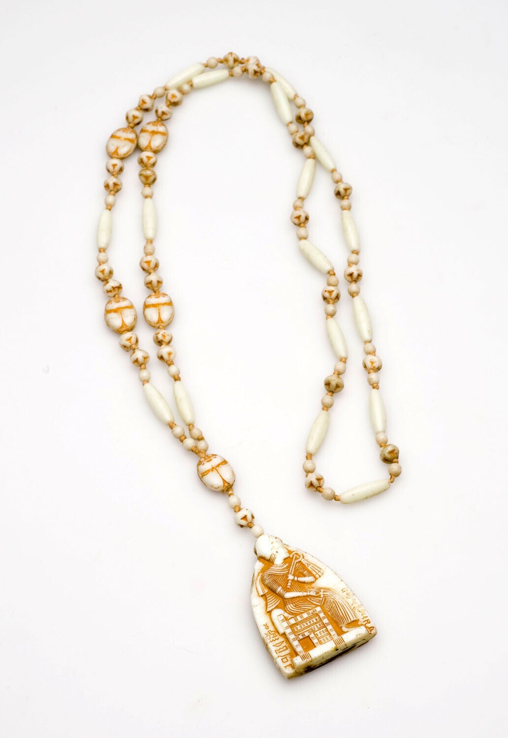 Halsketting van witte kralen met namaakscarabeeën