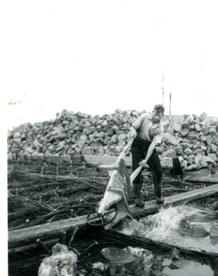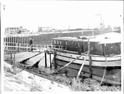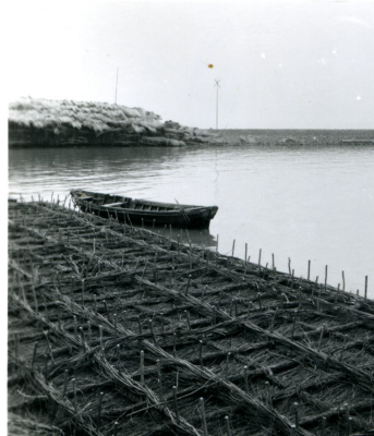 Woonark bij beschoeiing van de werkput bij Den Oever...