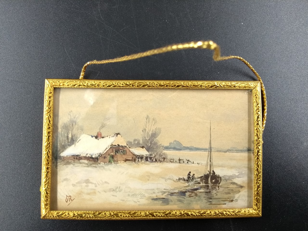 Schildering van huis en zeilboot in winterlandschap.