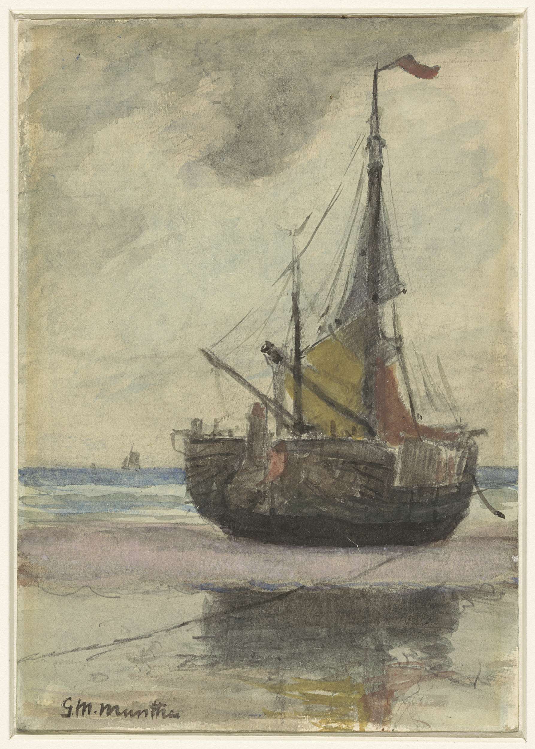 Vissersboot op het strand met gereefd zeil