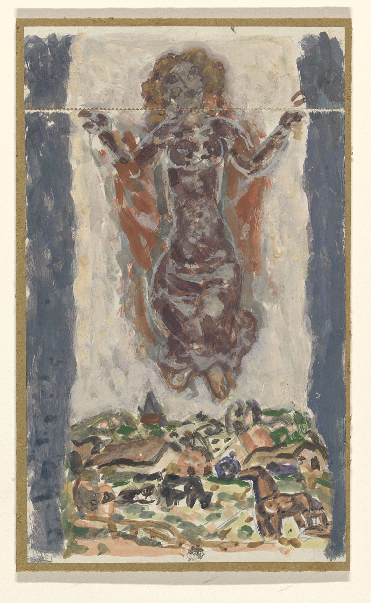 Twee naakte figuren en een paard aan de zee