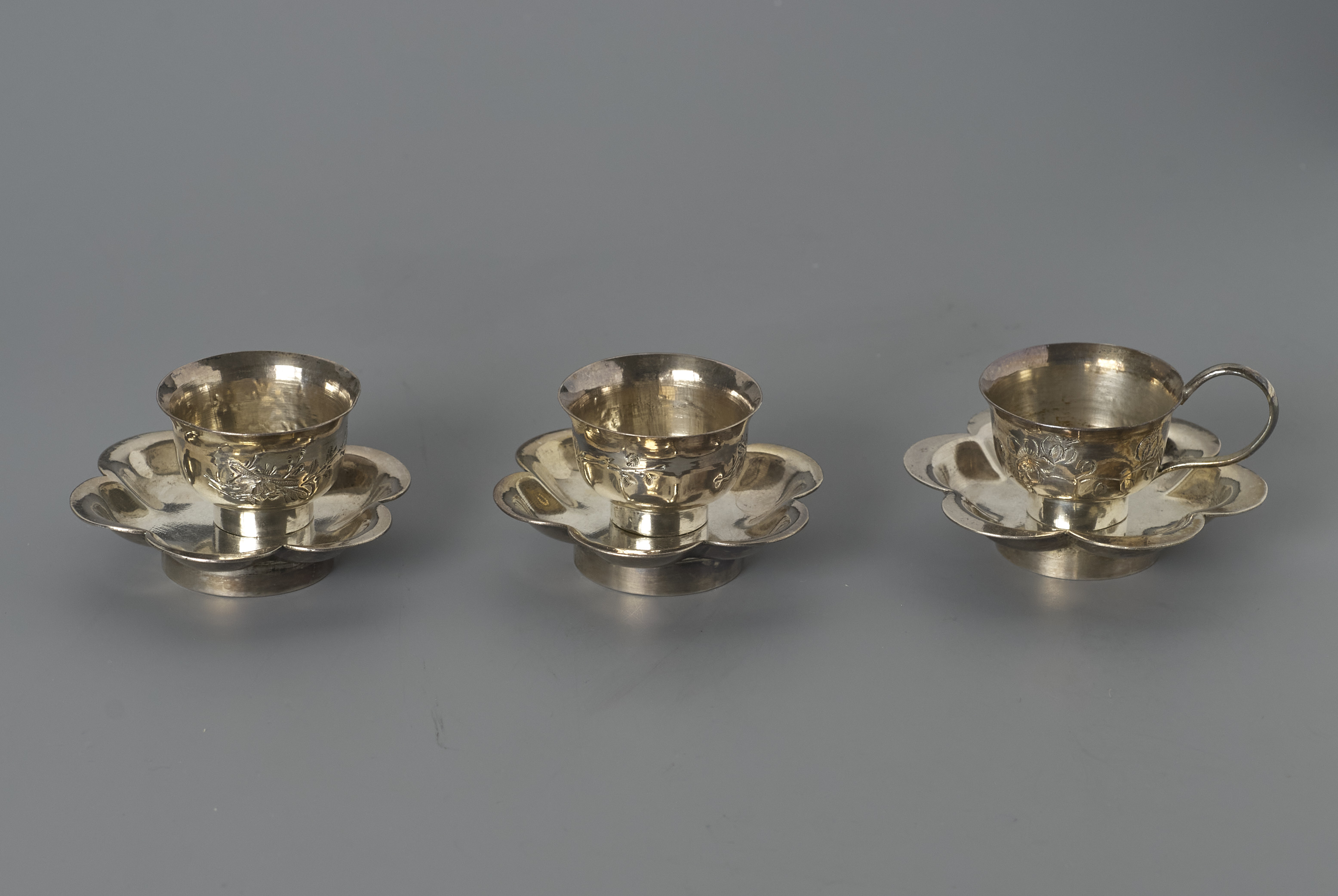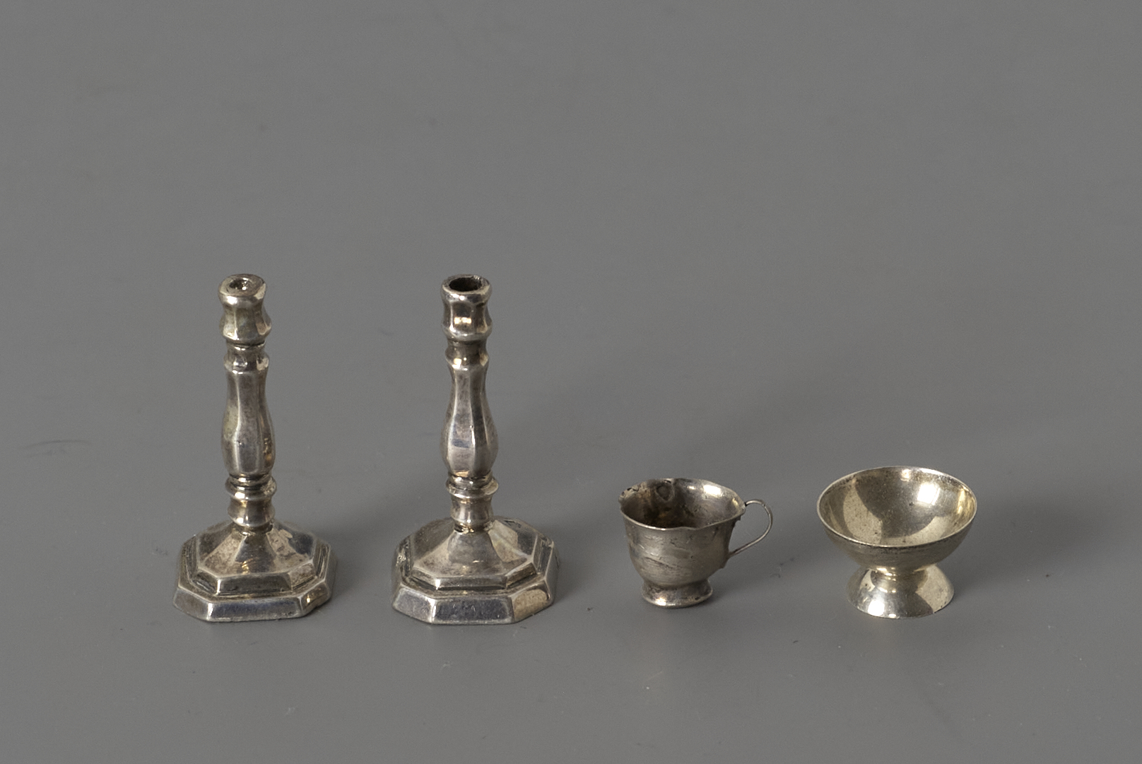 set van twee kandelaars, beker en schaal