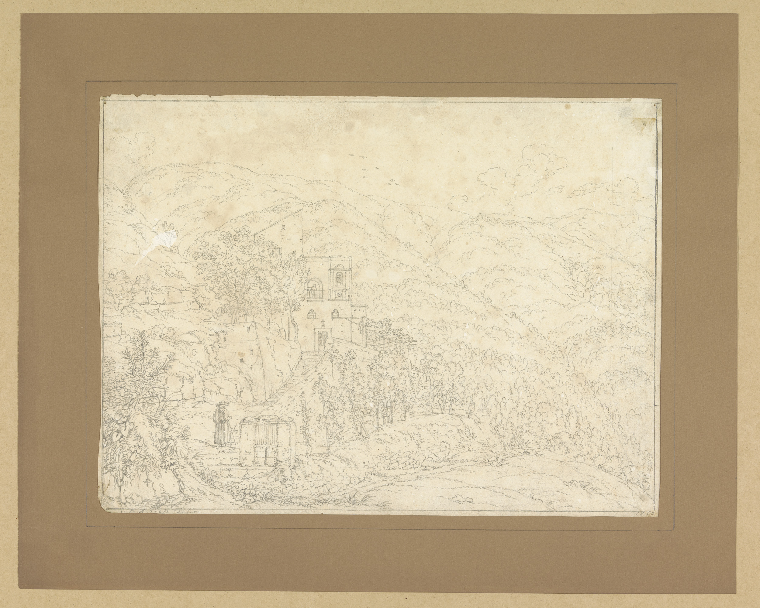 Berglandschap met gebouw, met op de voorgrond een pa...