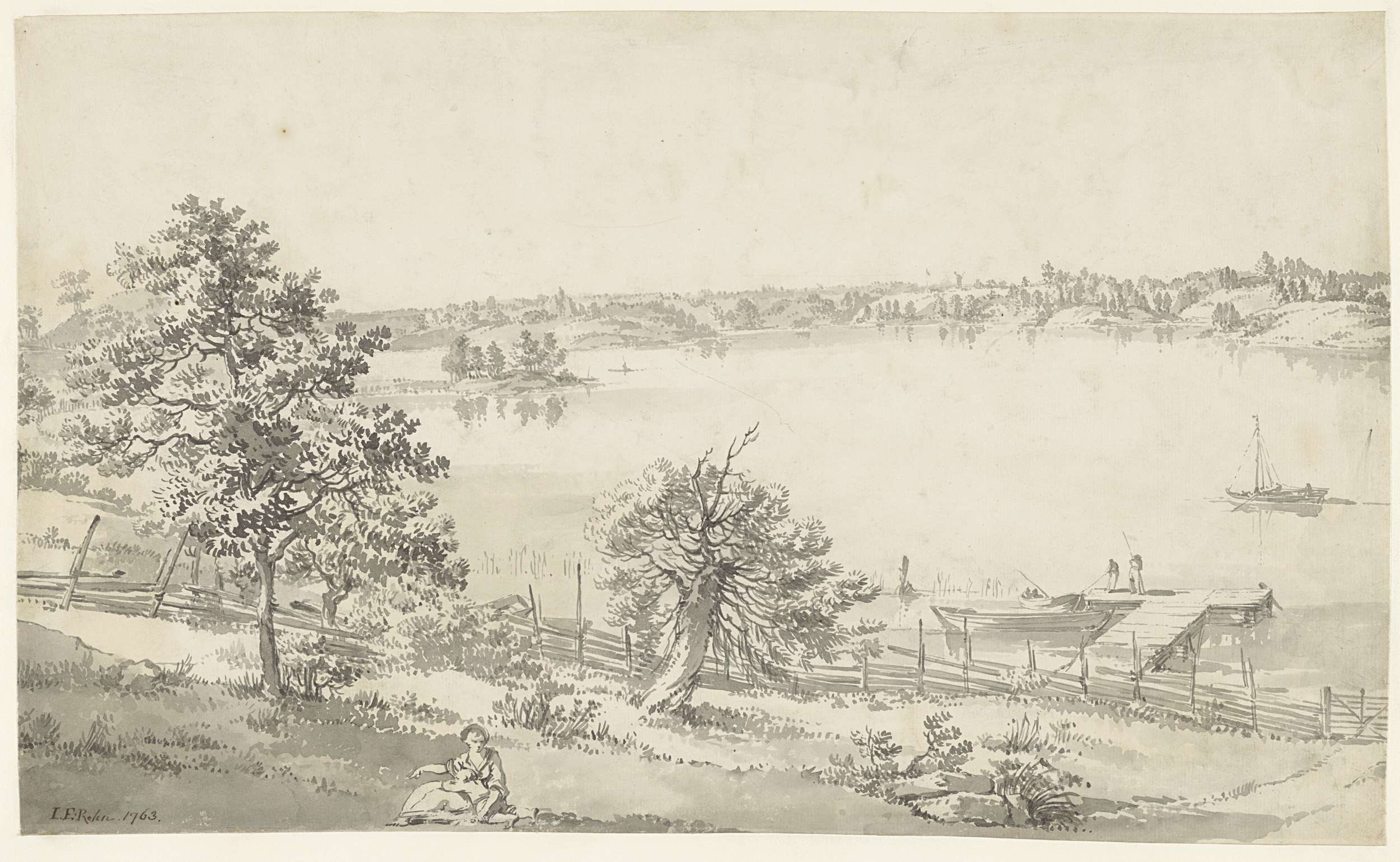 Gezicht op een breed water in de bergen met figuren ...