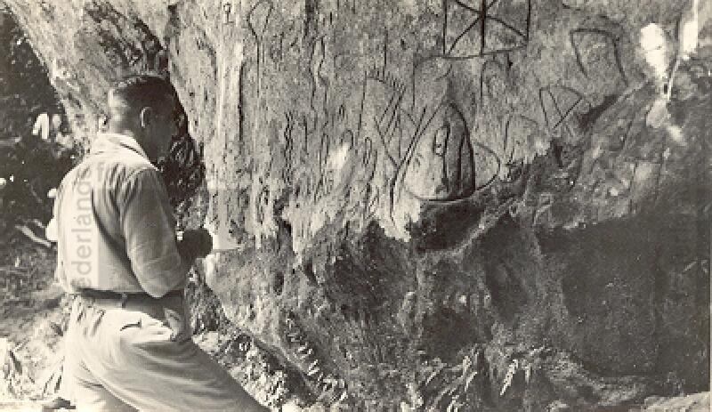 Man bekijkt rotstekeningen, indonesië (1950-1970)