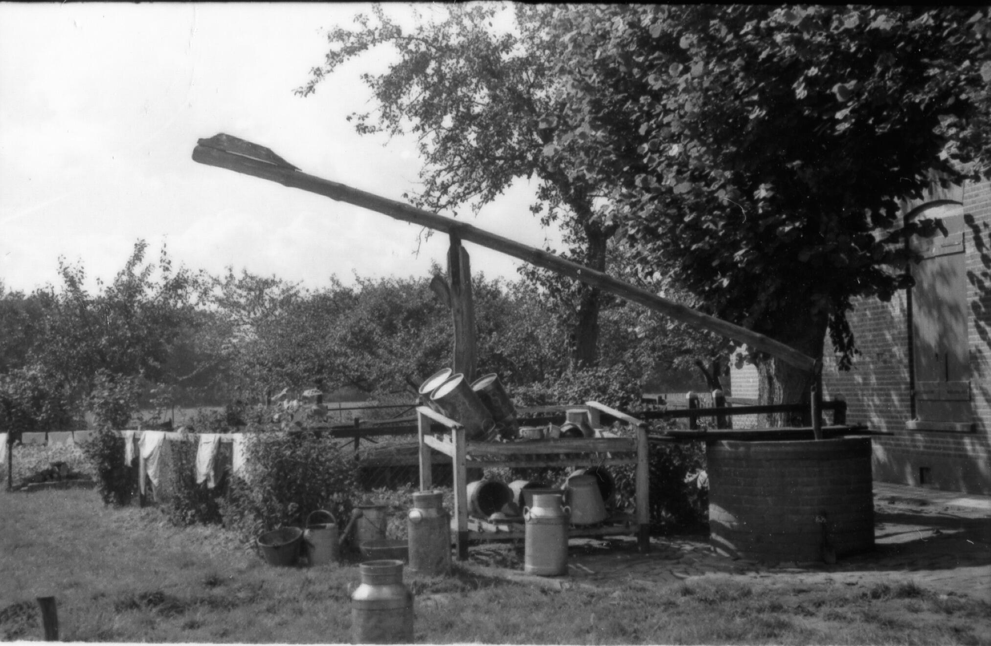 Waterput en melkbussenrek, Laren, 1938 (zwart-wit foto)