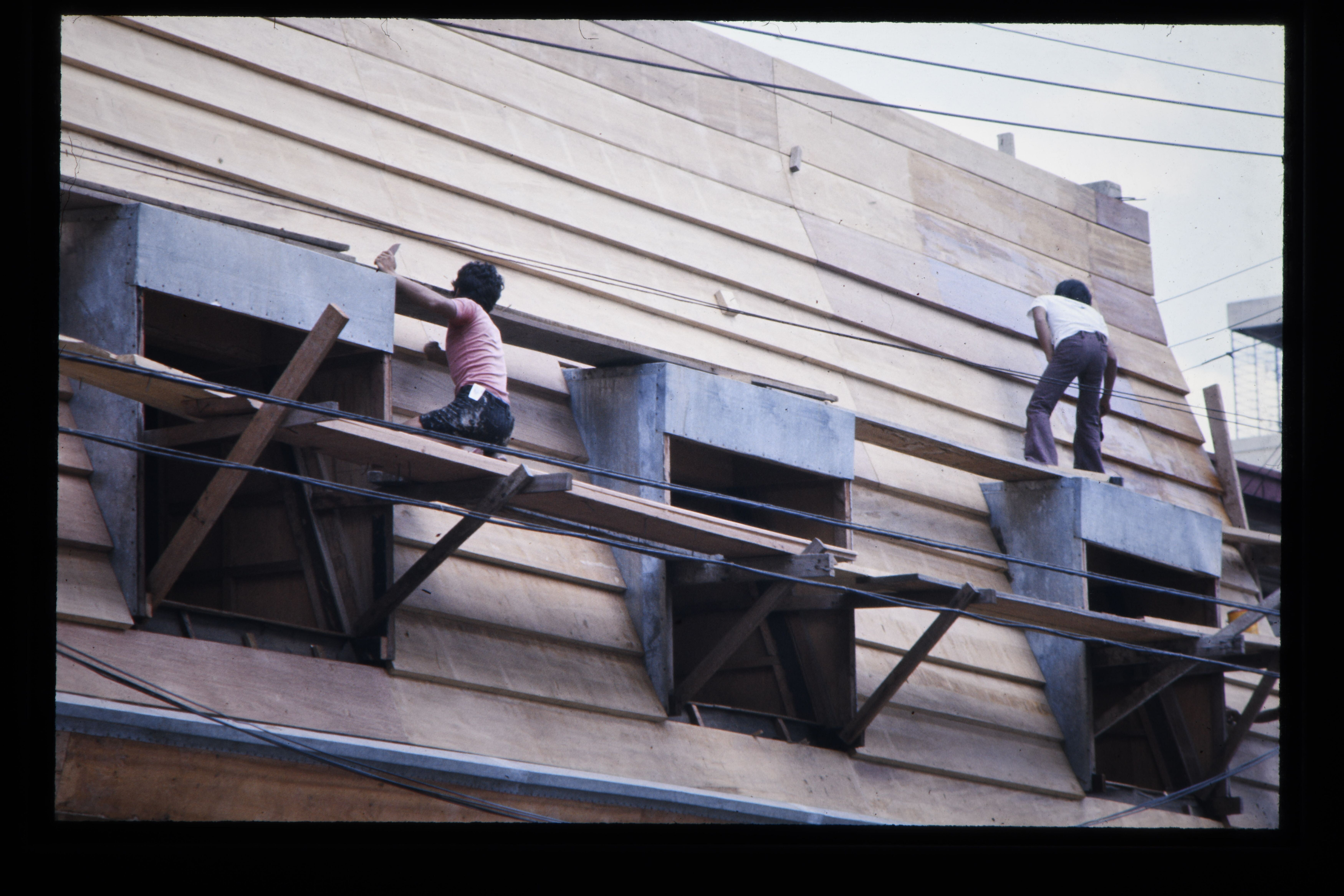 'Bouwvakkers bij de restauratie van een winkelpand, ...