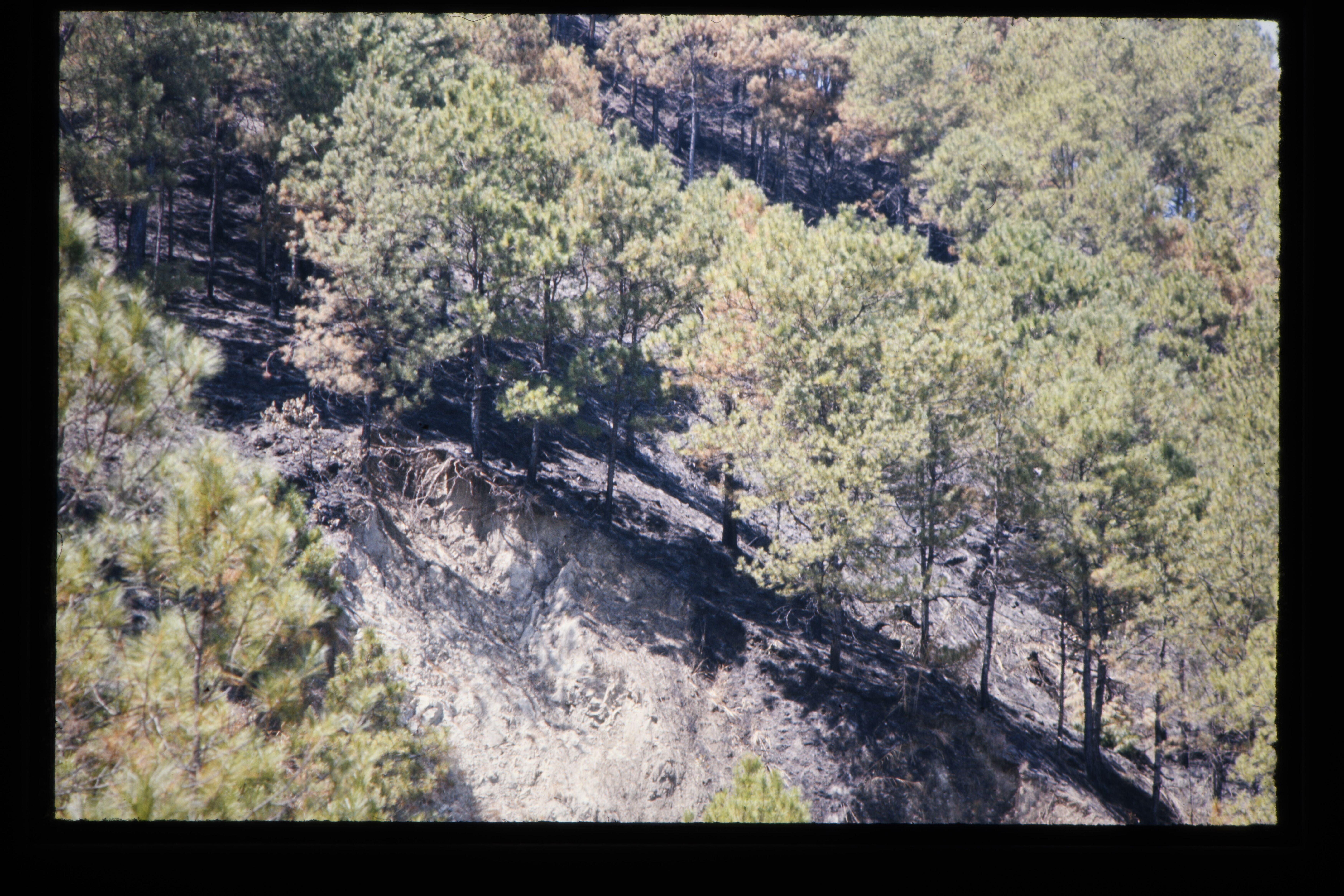 'Door brand aangetaste pinus (den) aanplant, die hel...