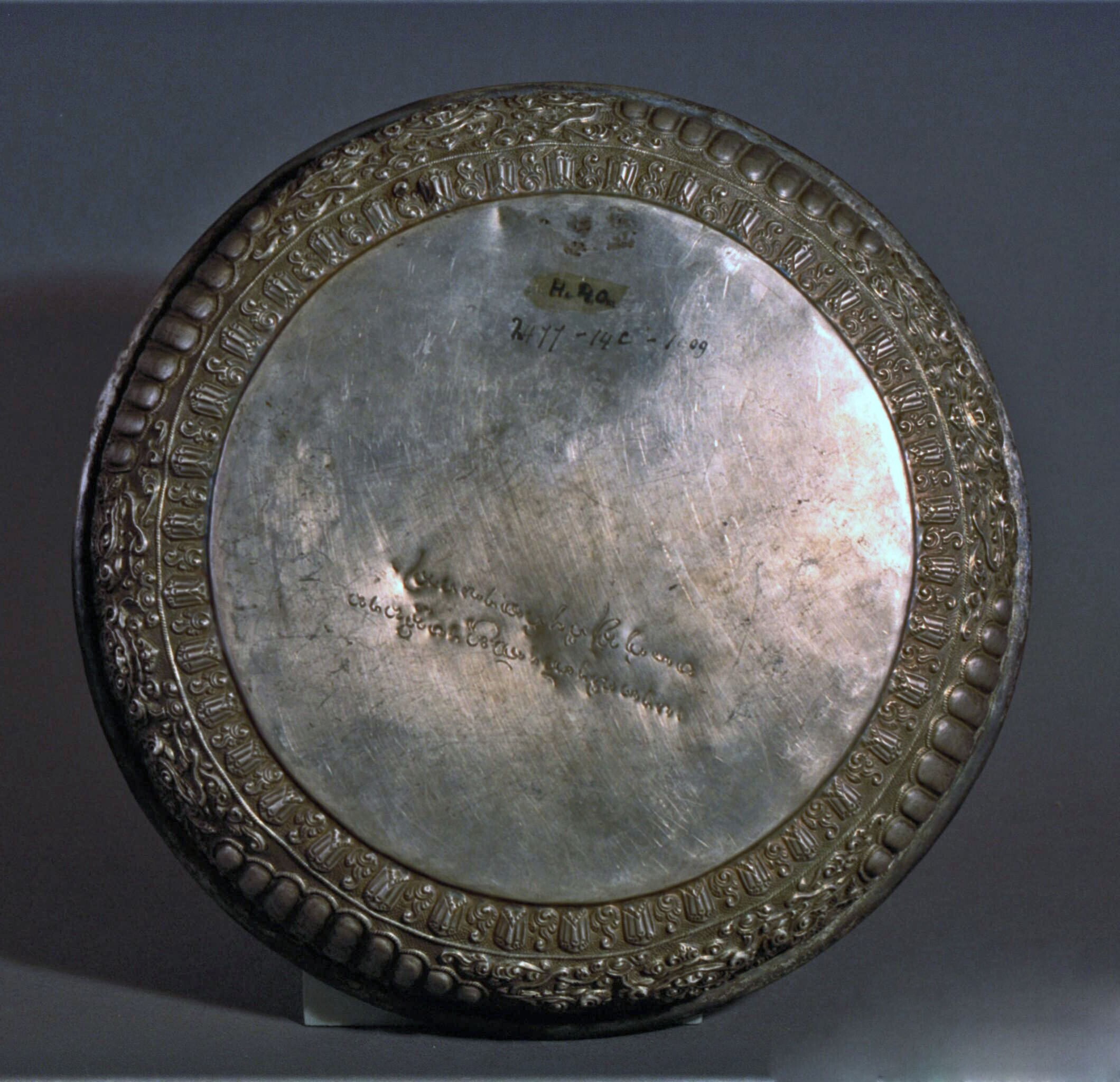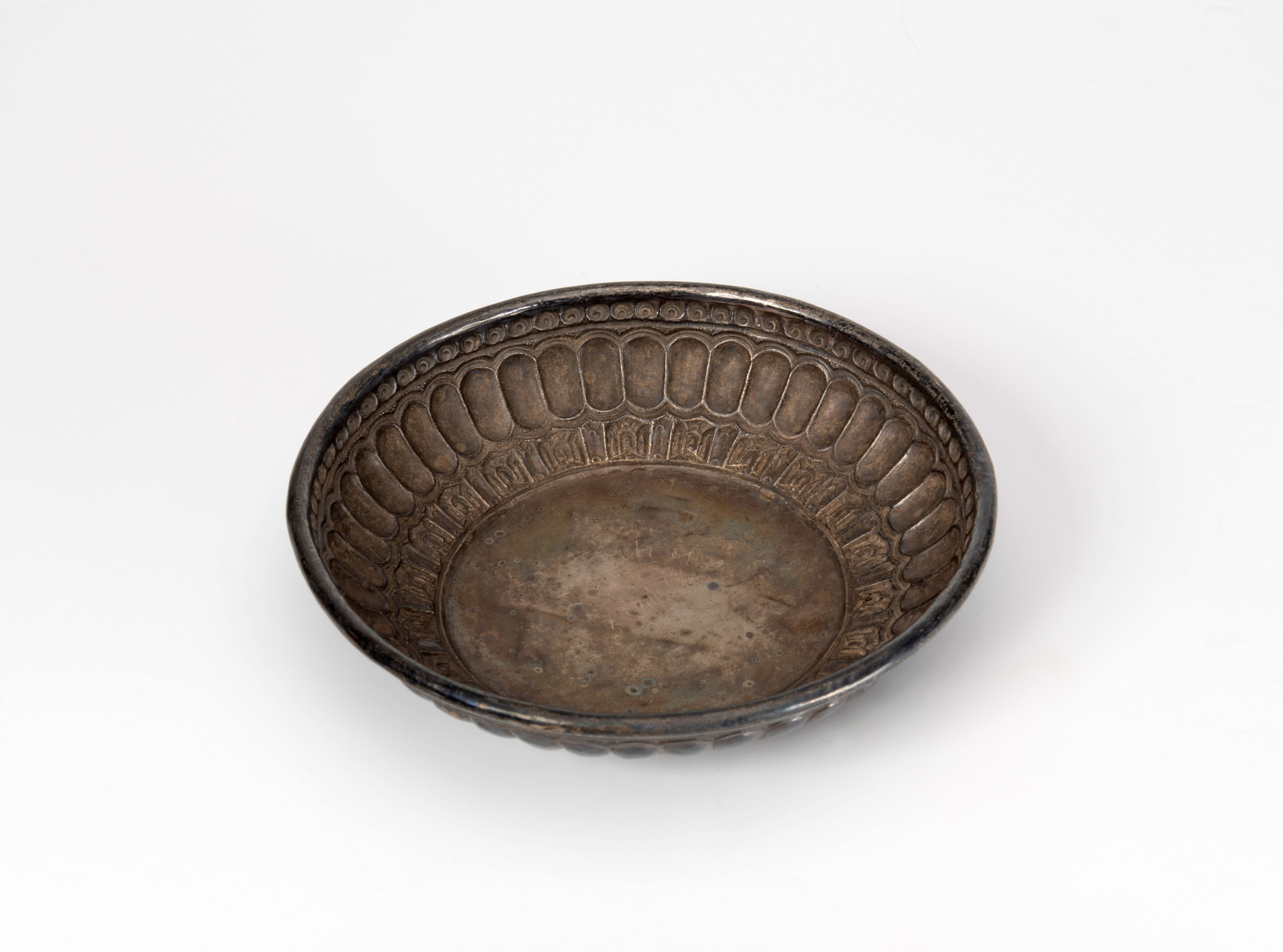 Zilveren schaal met gedreven rand en inscriptie op d...