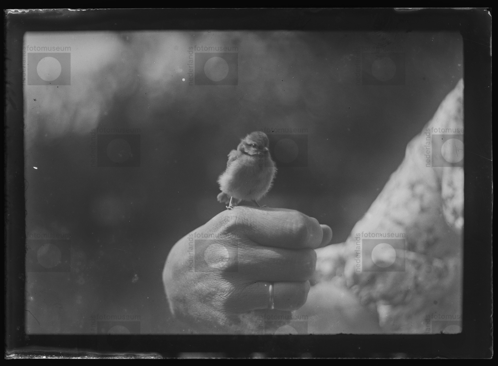Jonge pimpelmees op vrouwenhand (echtgenote Strijbos...