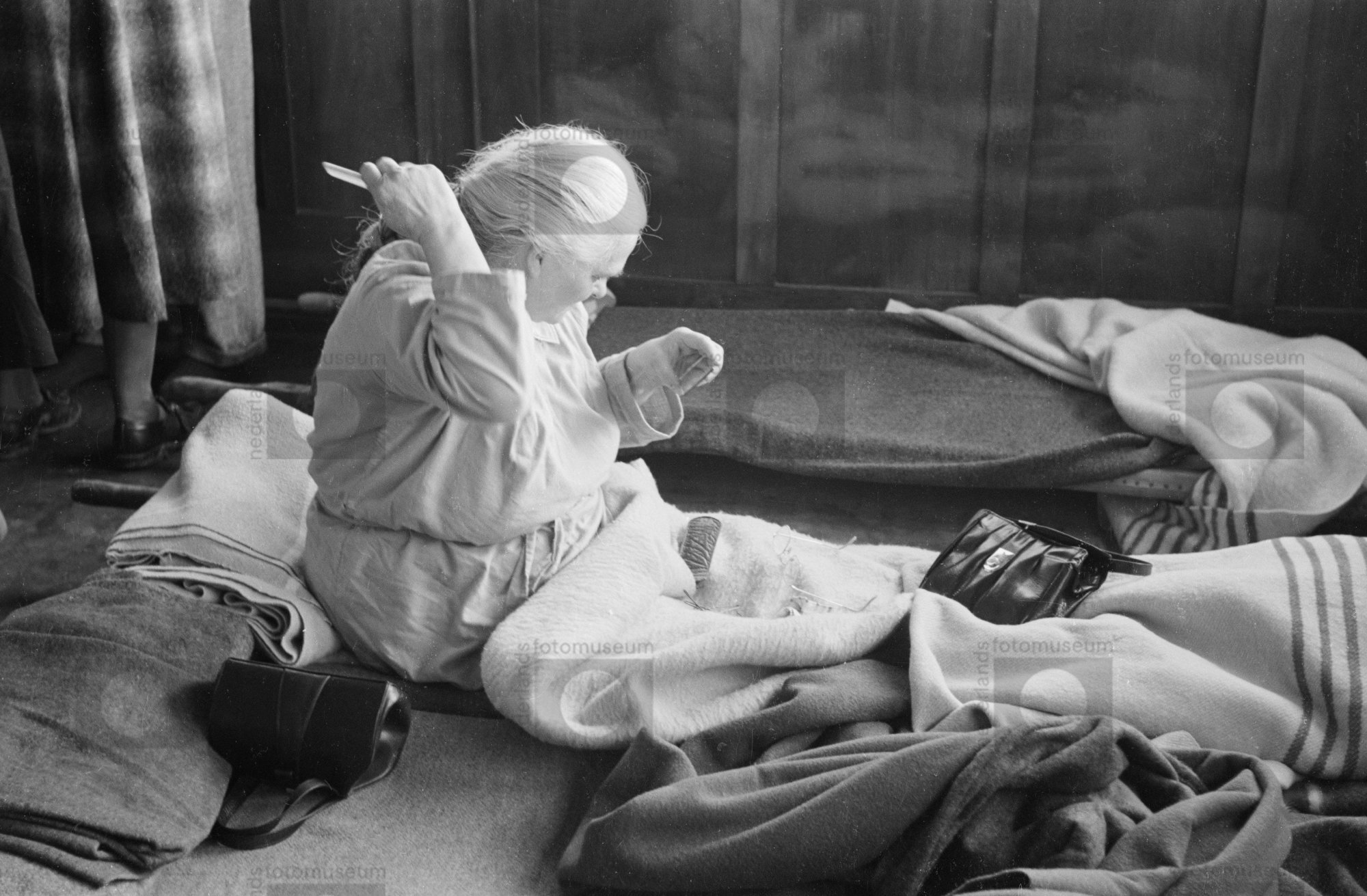 Oude vrouw kamt haren op een veldbed na evacuatie na...