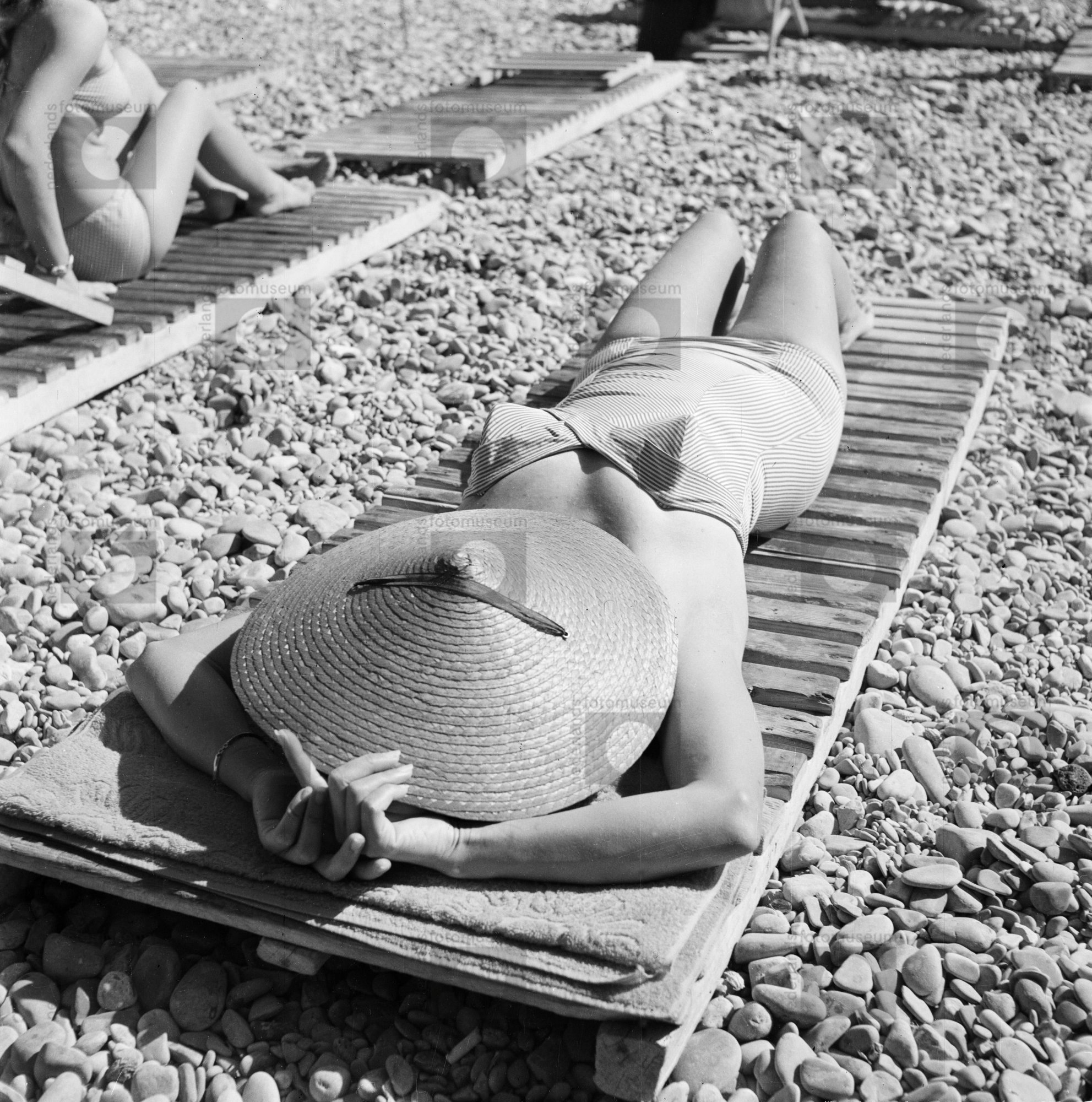 Zonnebadende vrouw op strand met kiezelstenen (z.j.)