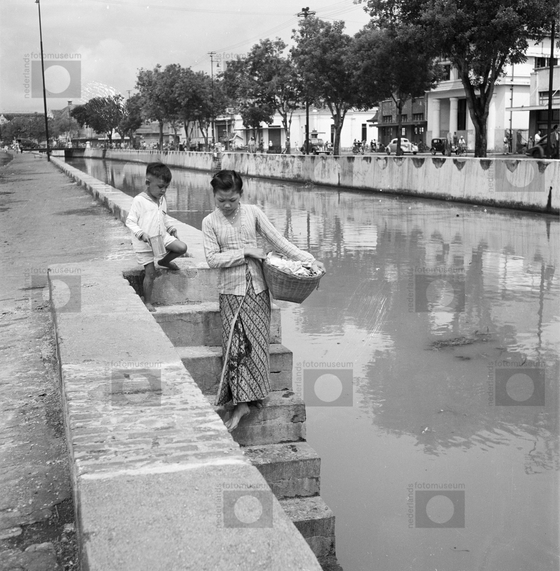 Vrouw met wasmand onderweg naar oever van stadsgrach...