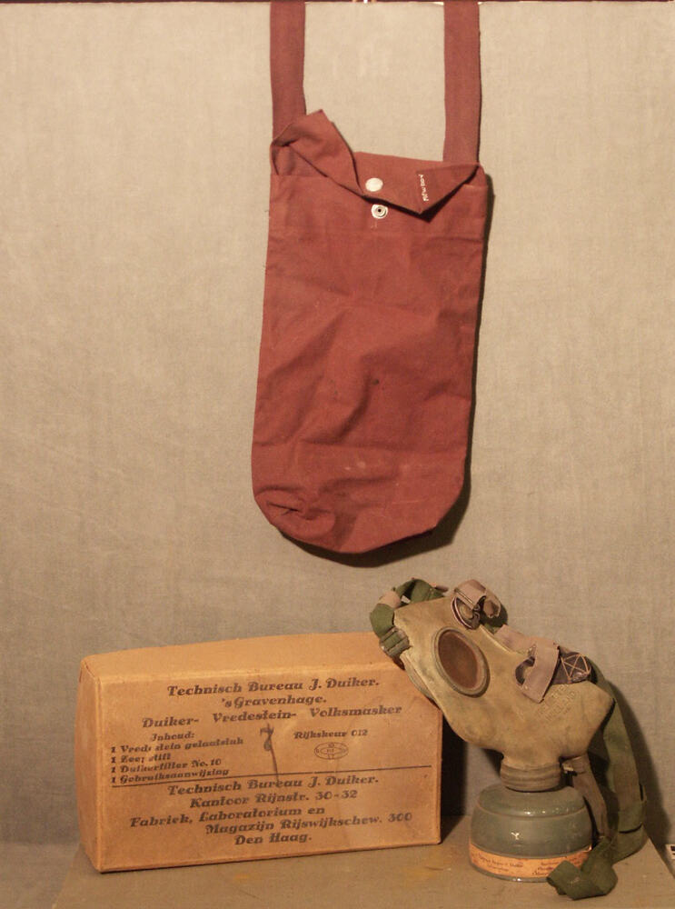 gasmasker met onderdelen met canvas draagtas en bijb...