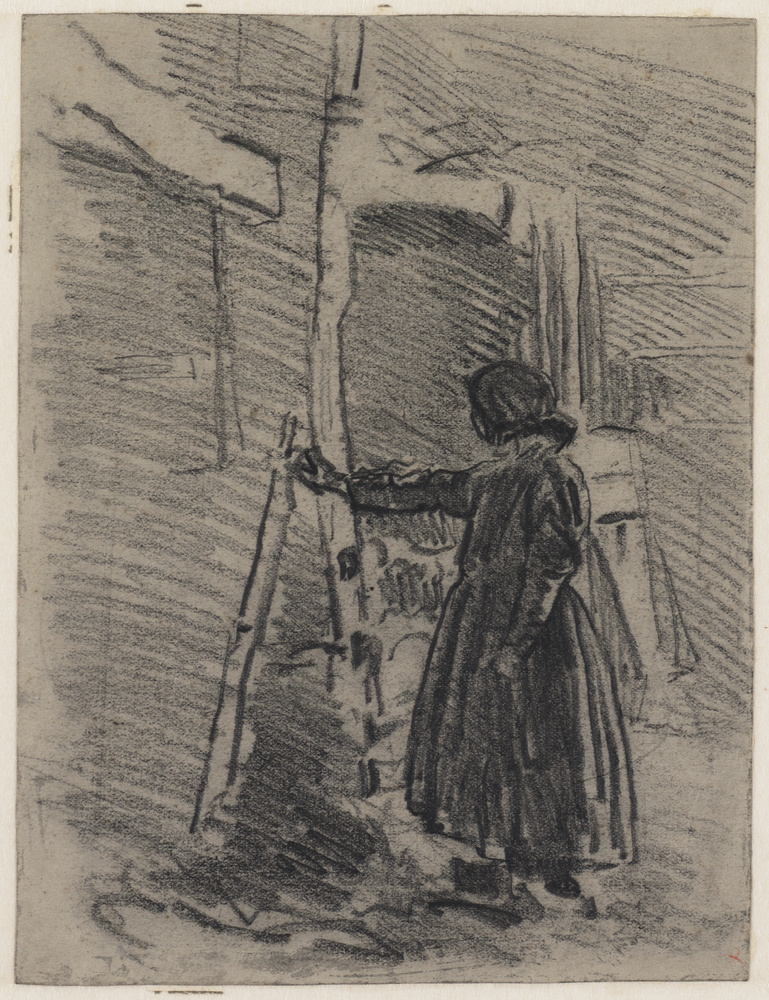 Boerin voor een bouwsel met uitgestrekte rechter arm