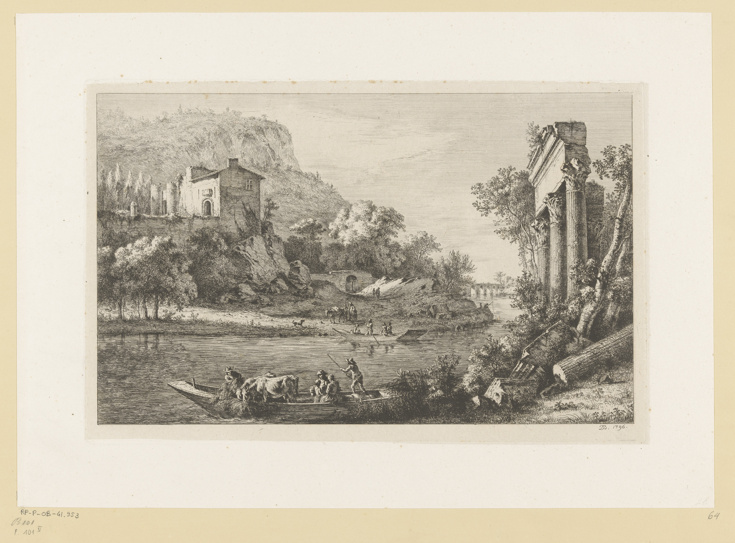 Rivierlandschap met overstekende figuren en ruïnes
