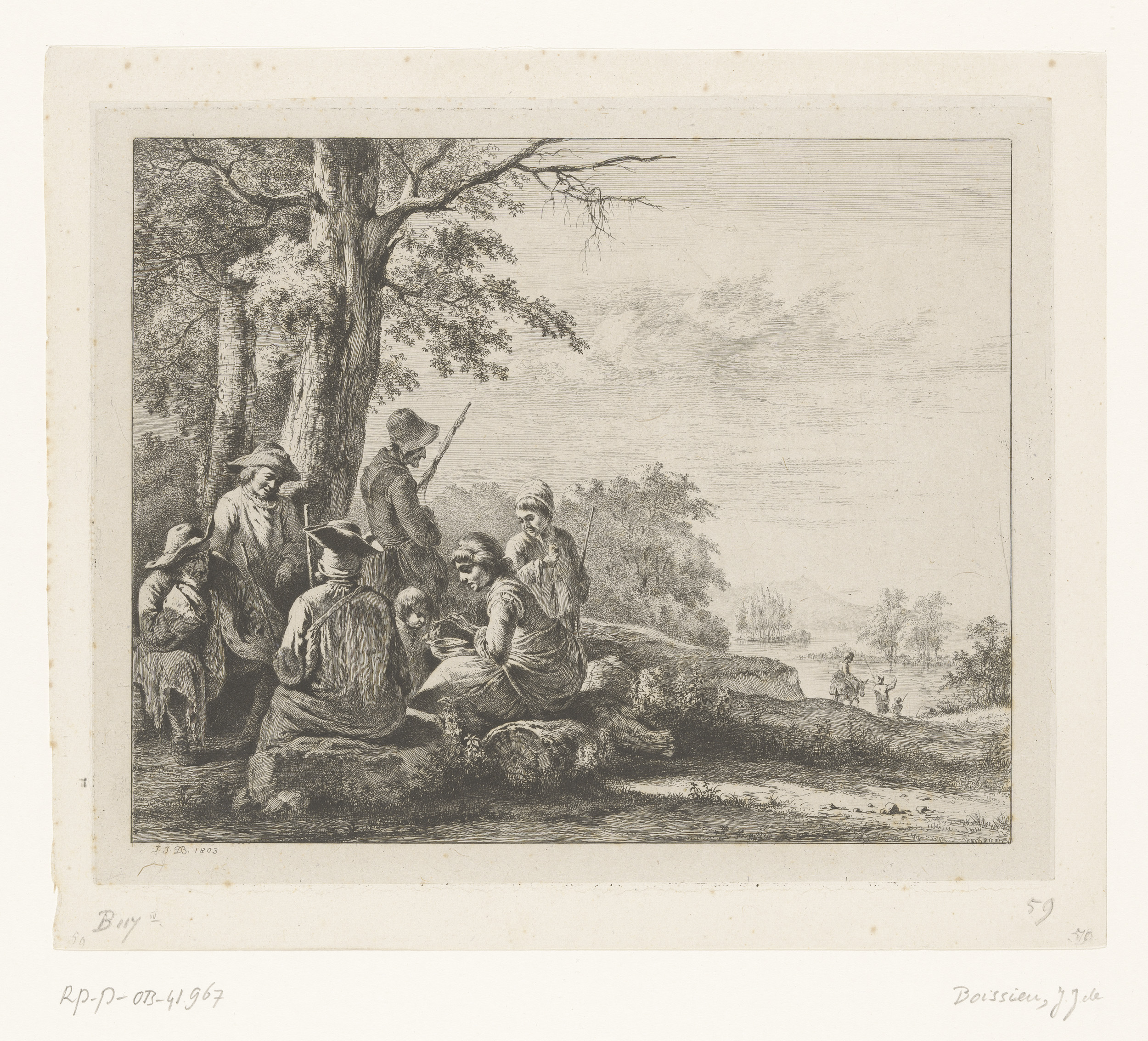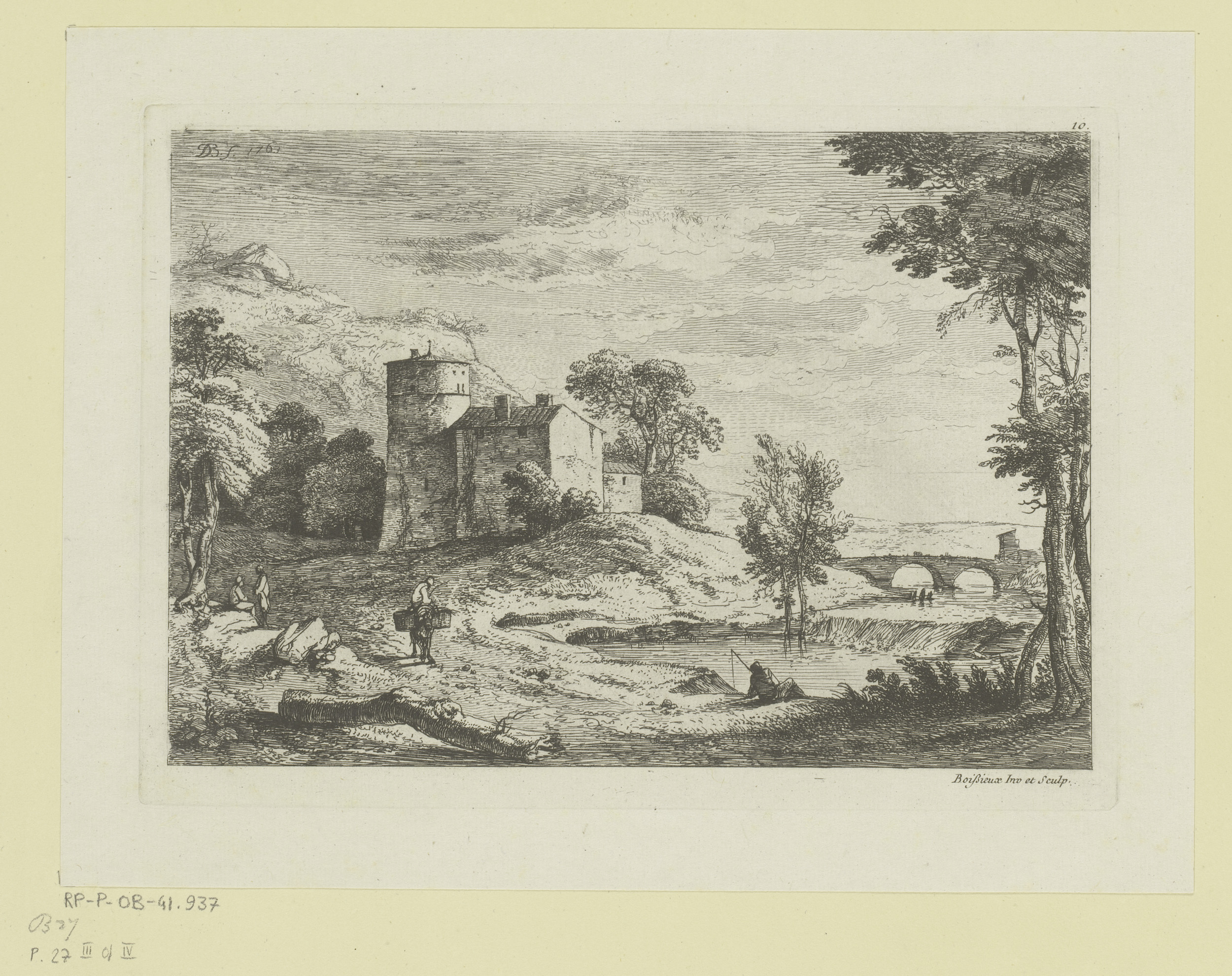 Landschap met een boer op een ezel en een visser aan...