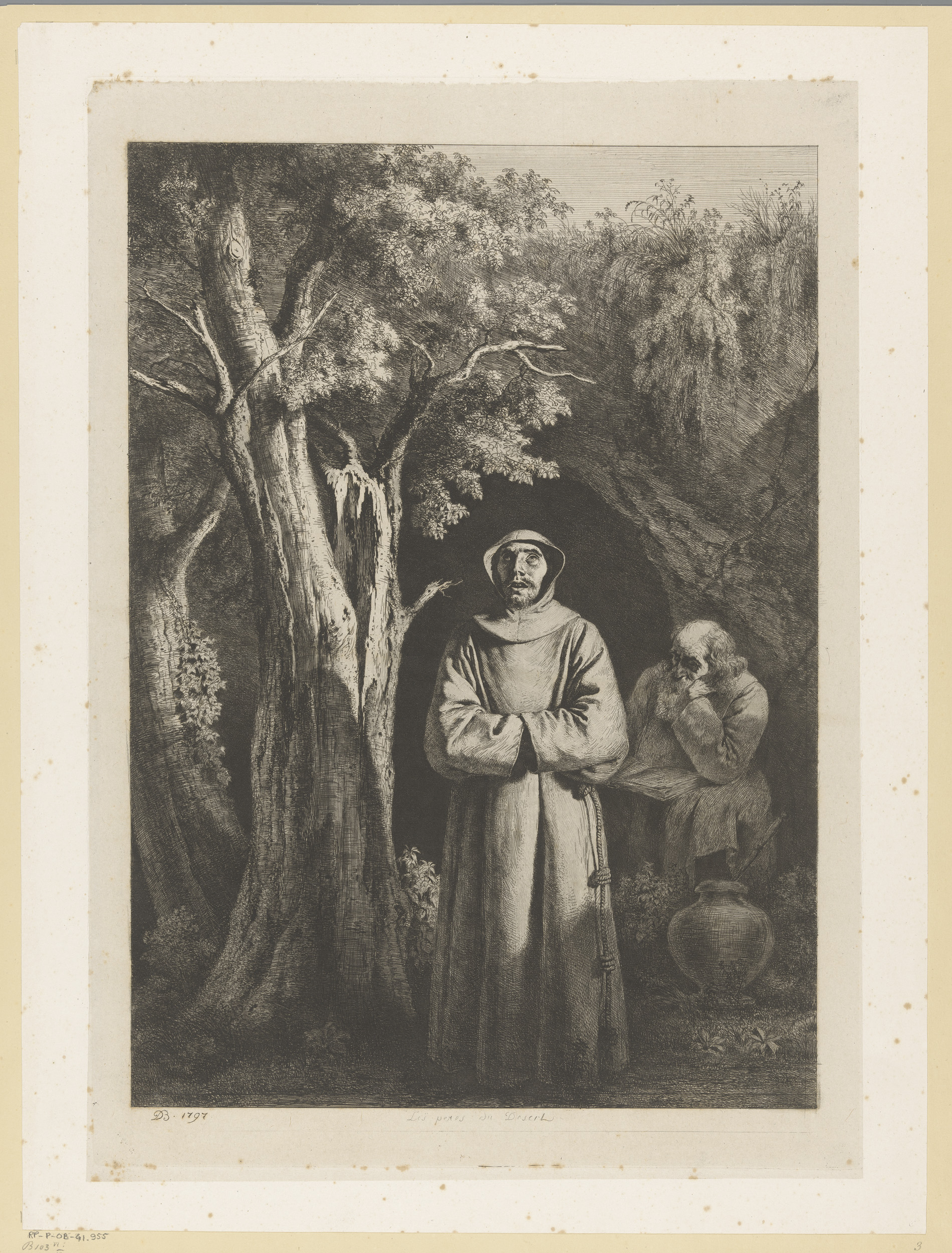 Twee Franciscaner monniken voor een grot