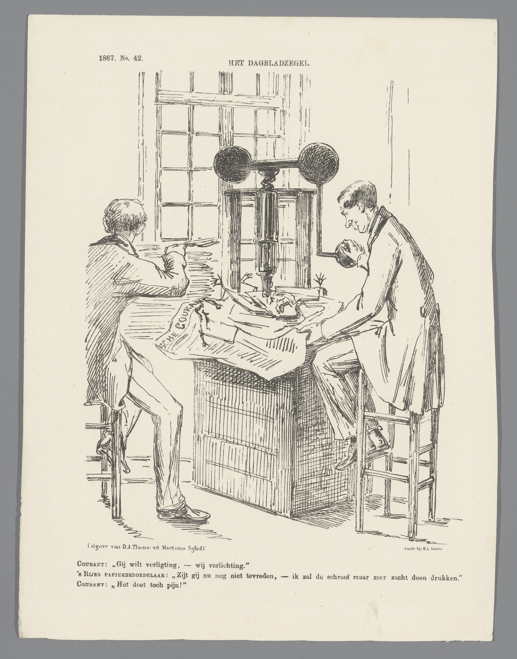 Spotprent op de verlaging van het dagbladzegel, 1867