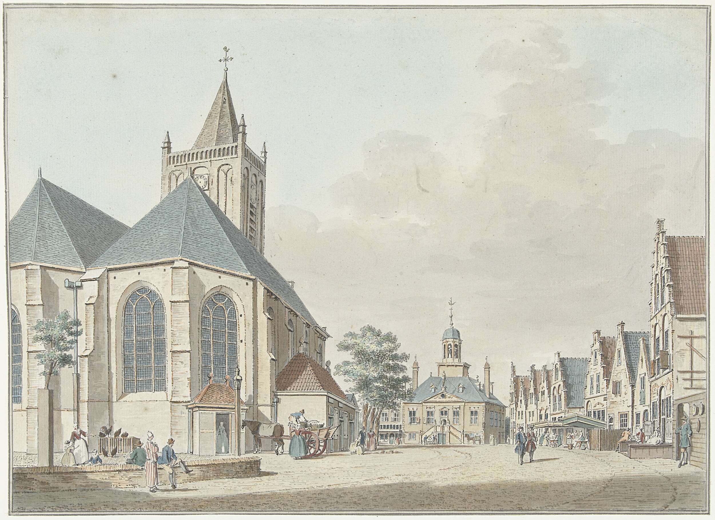 De markt te Vlaardingen met de kerk en het stadhuis