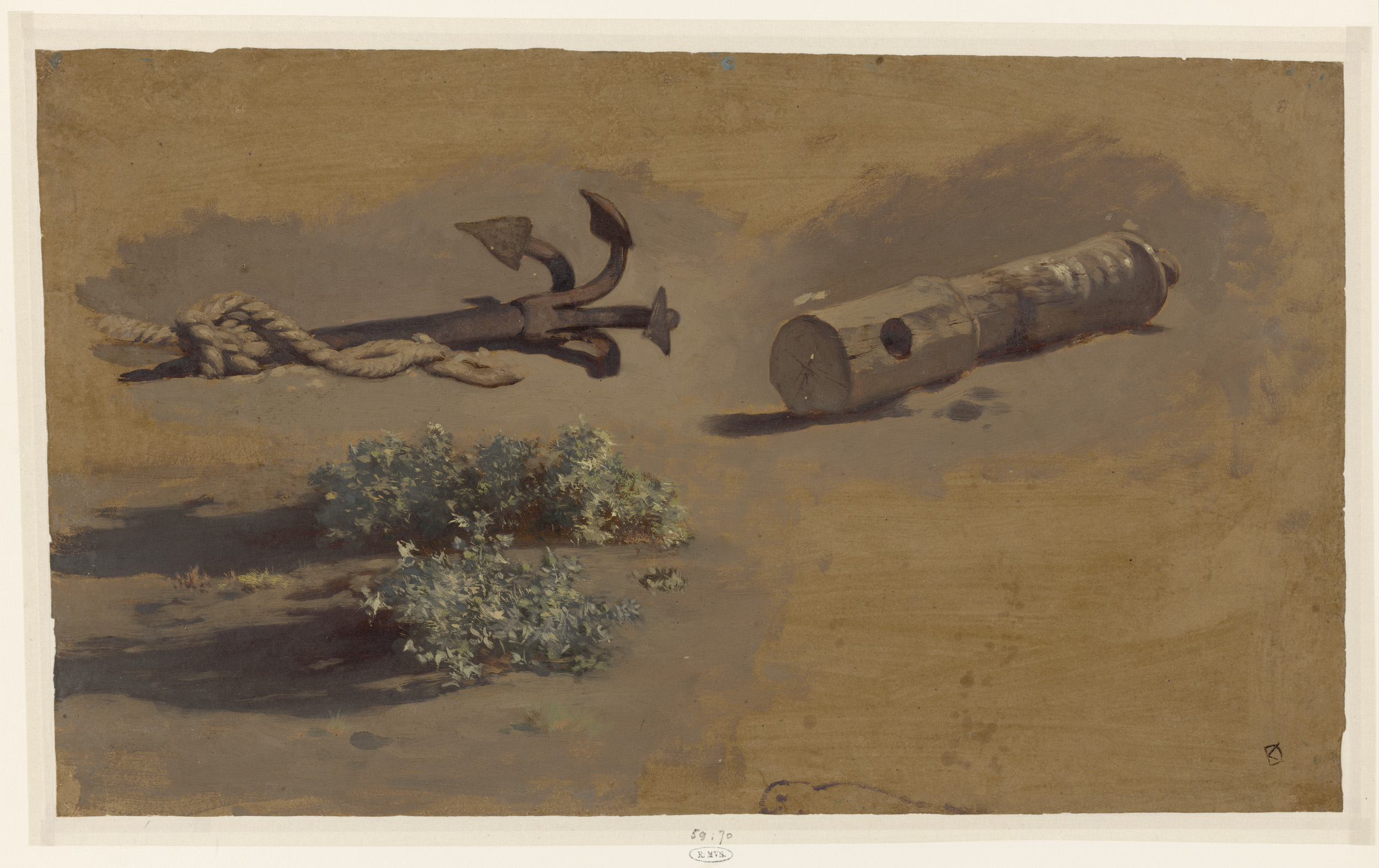 Studie van een anker, deel van een scheepsmast en st...