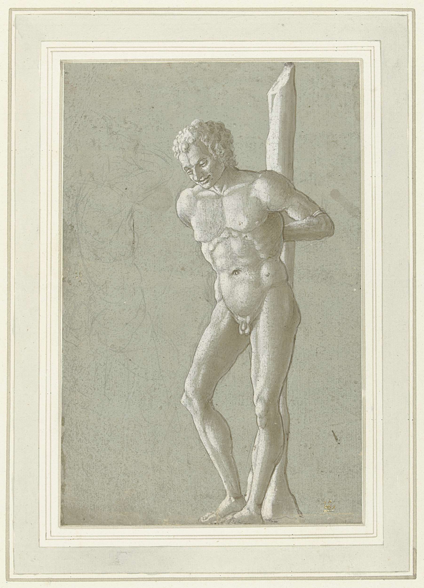 Vastgebonden naakte man en naakte figuur met opgeven...