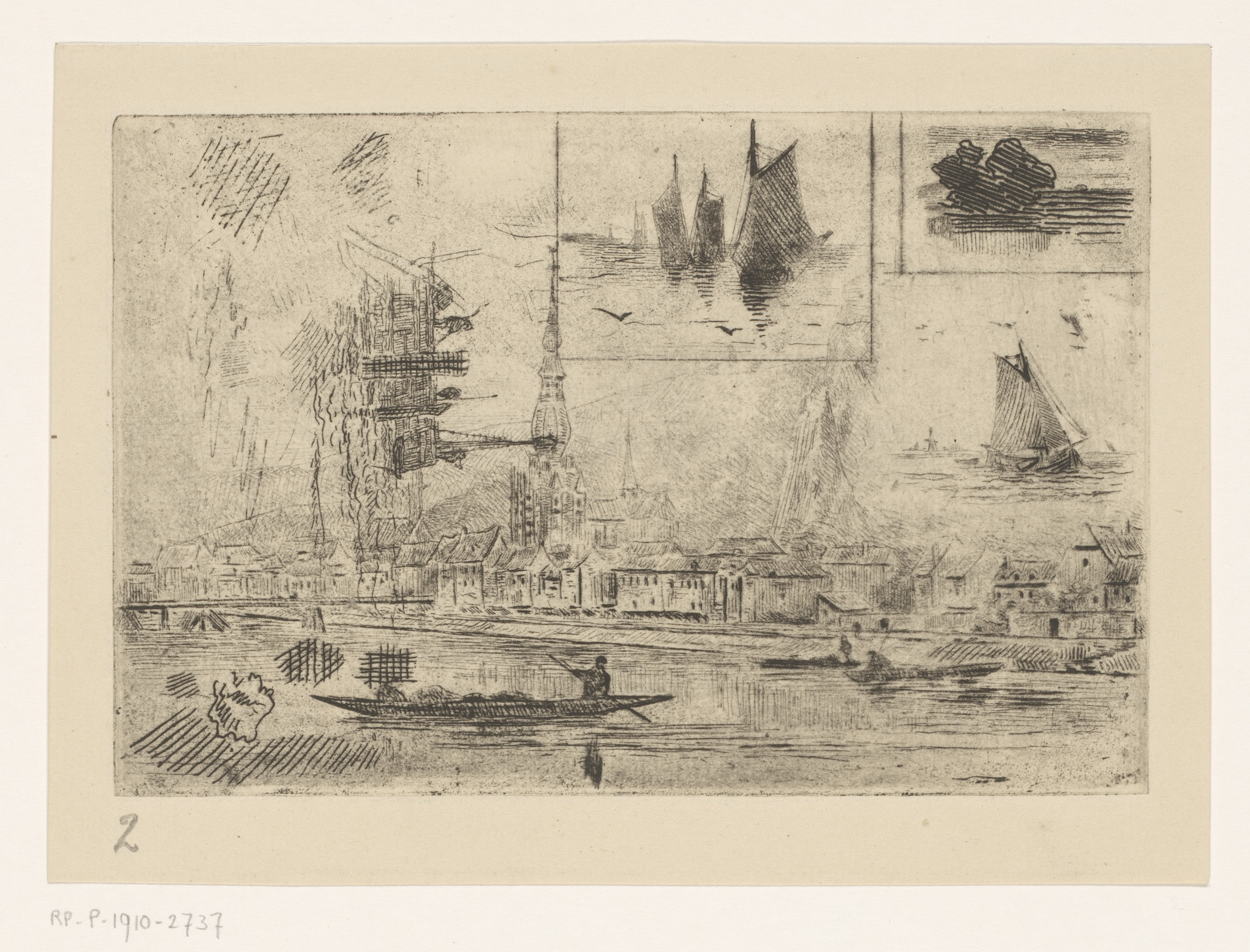 Gezicht op Dinant en zeegezichten met zeilschepen
