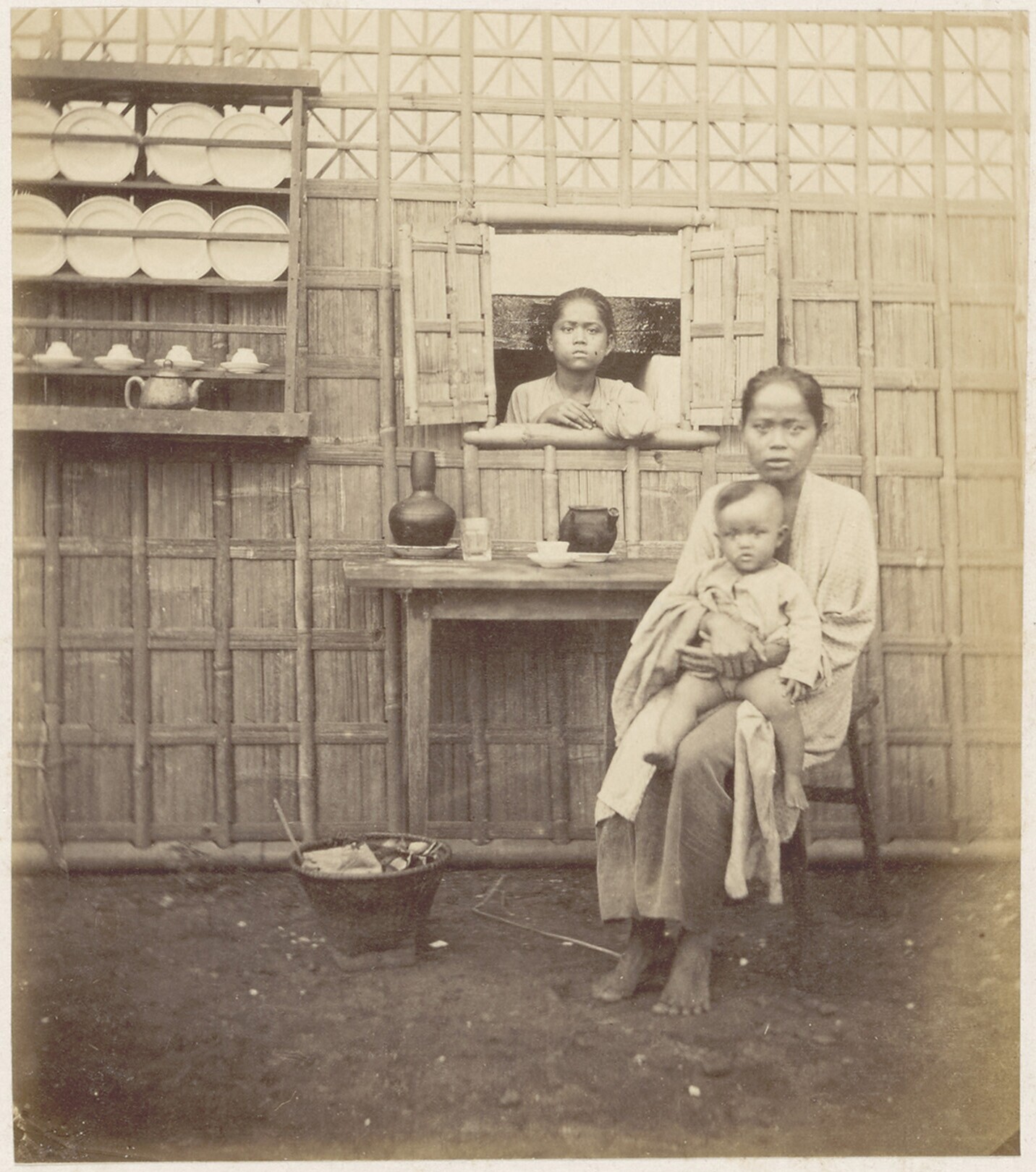 Studioportret van twee in een warung geënsceneerde v...