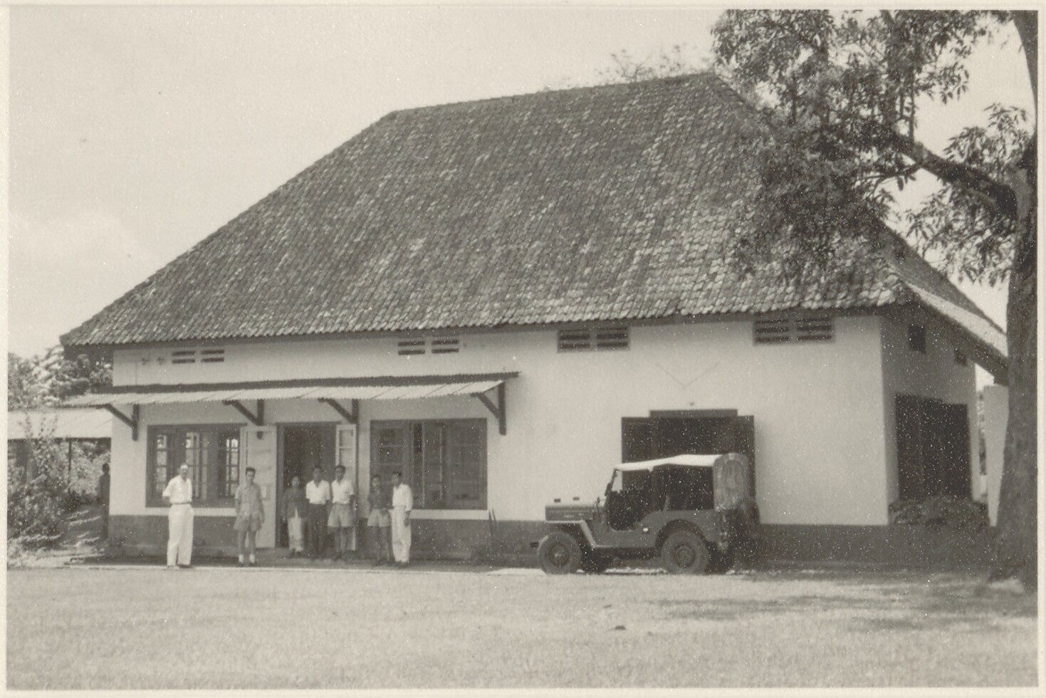 Een jeep en personeel voor het kantoor van de koffie...