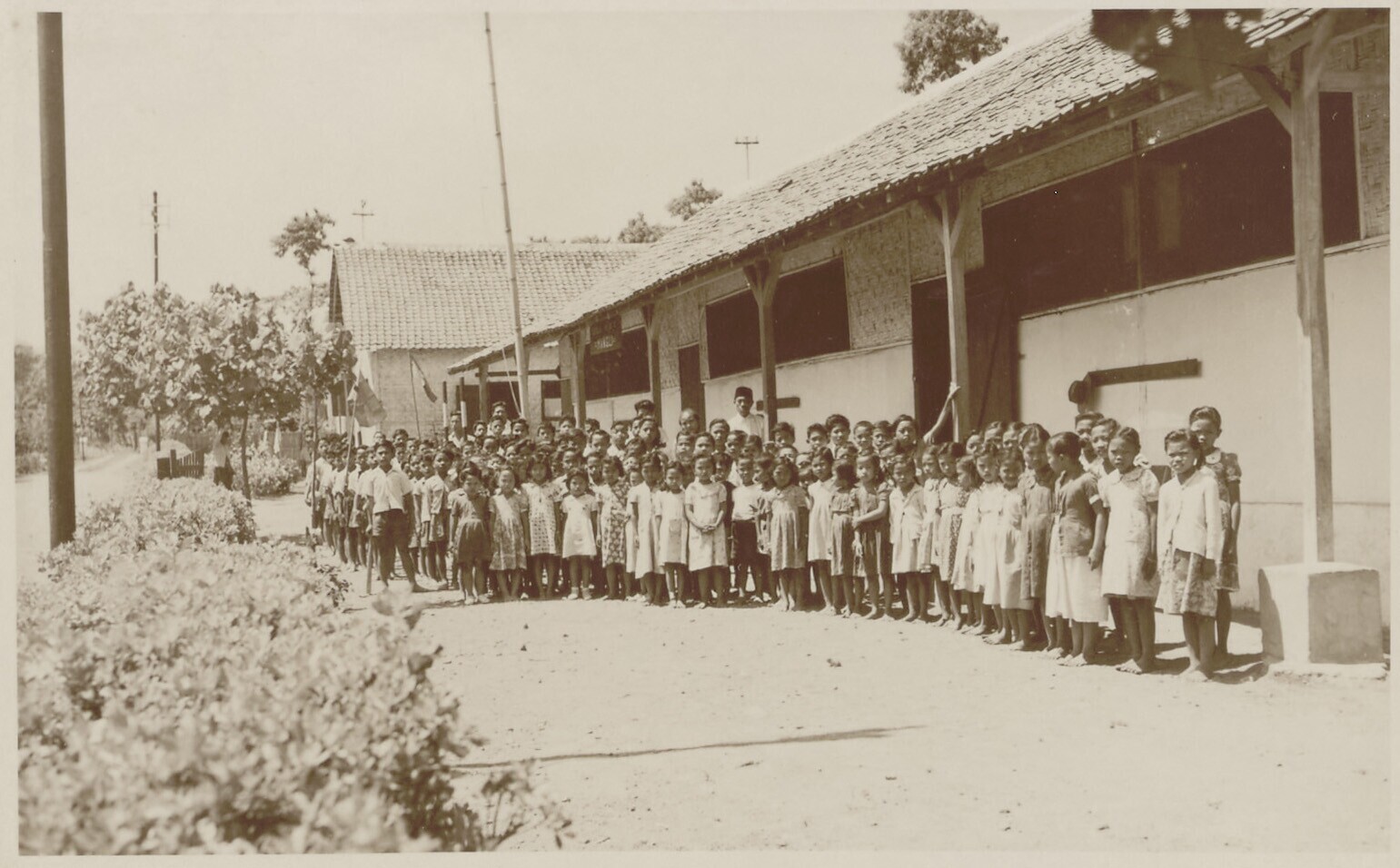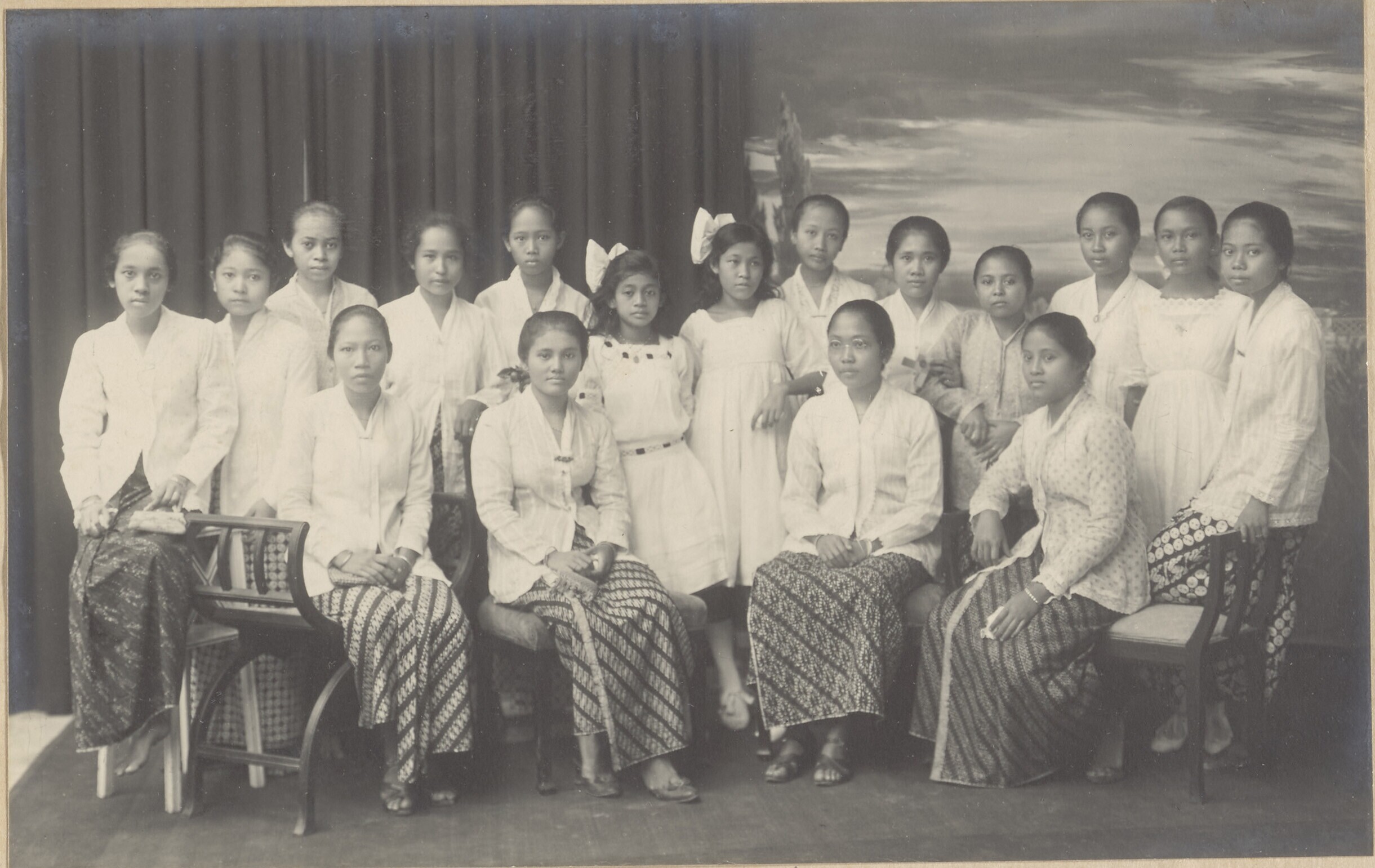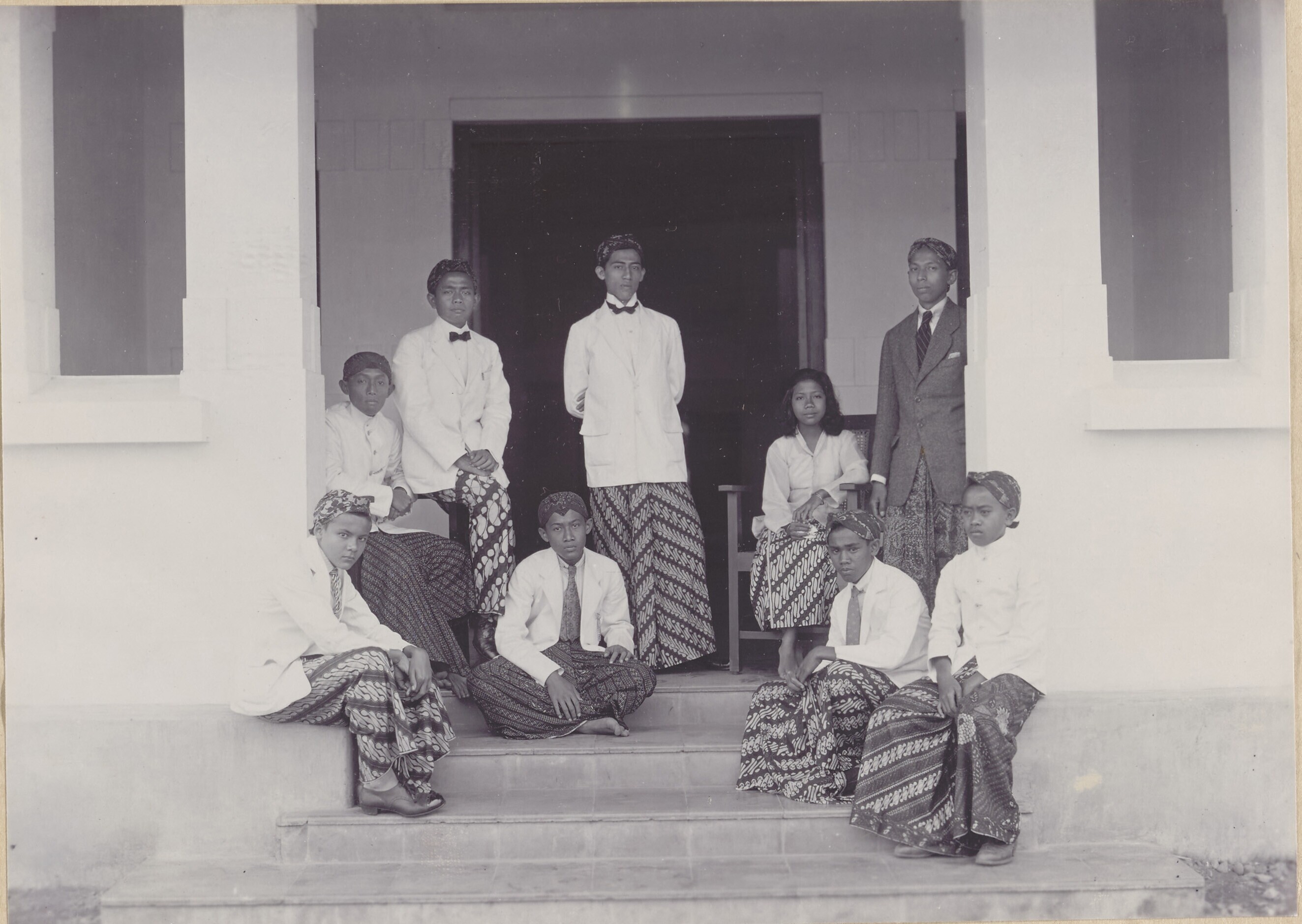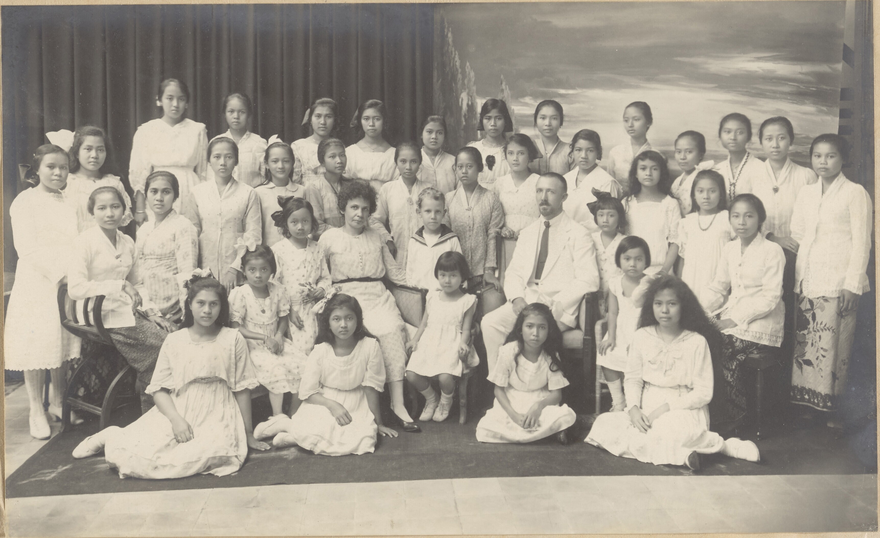 Groepsportret van (meisjes) leerlingen en twee wite ...