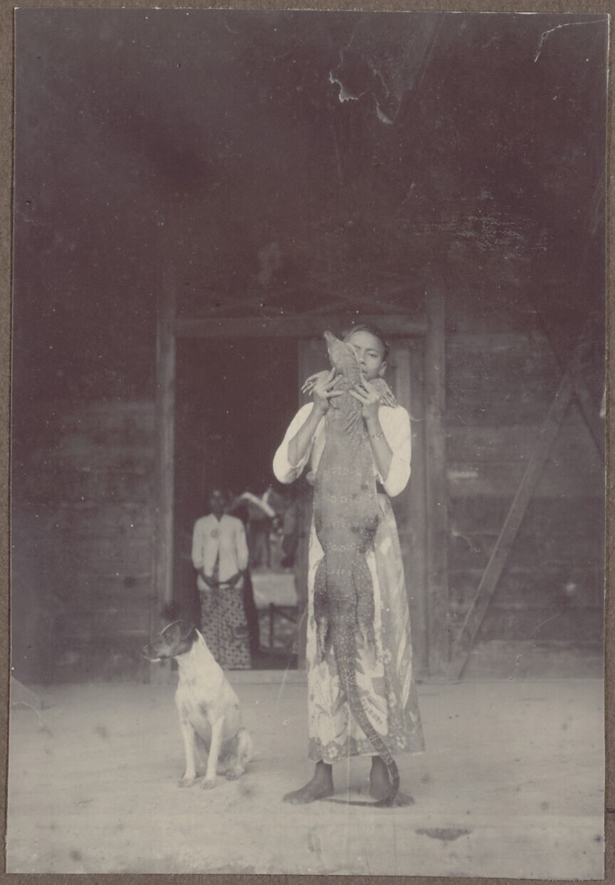 Javaanse jongen, Gangsar, poseert met een varaan van...