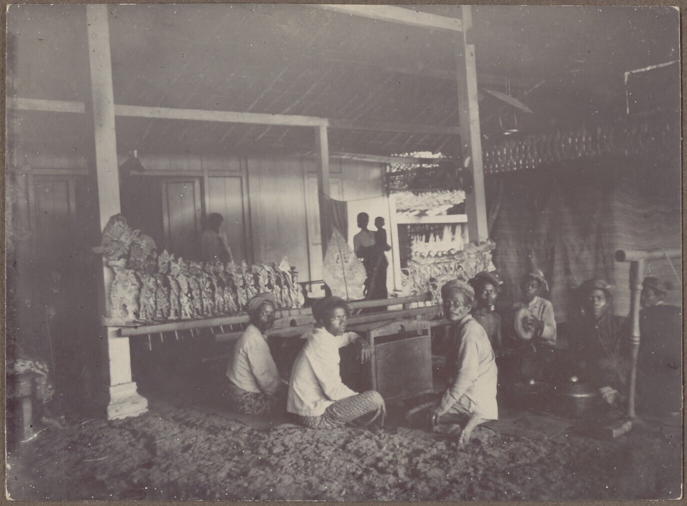 Een wajang kelitik voorstelling met gamelanorkest in...
