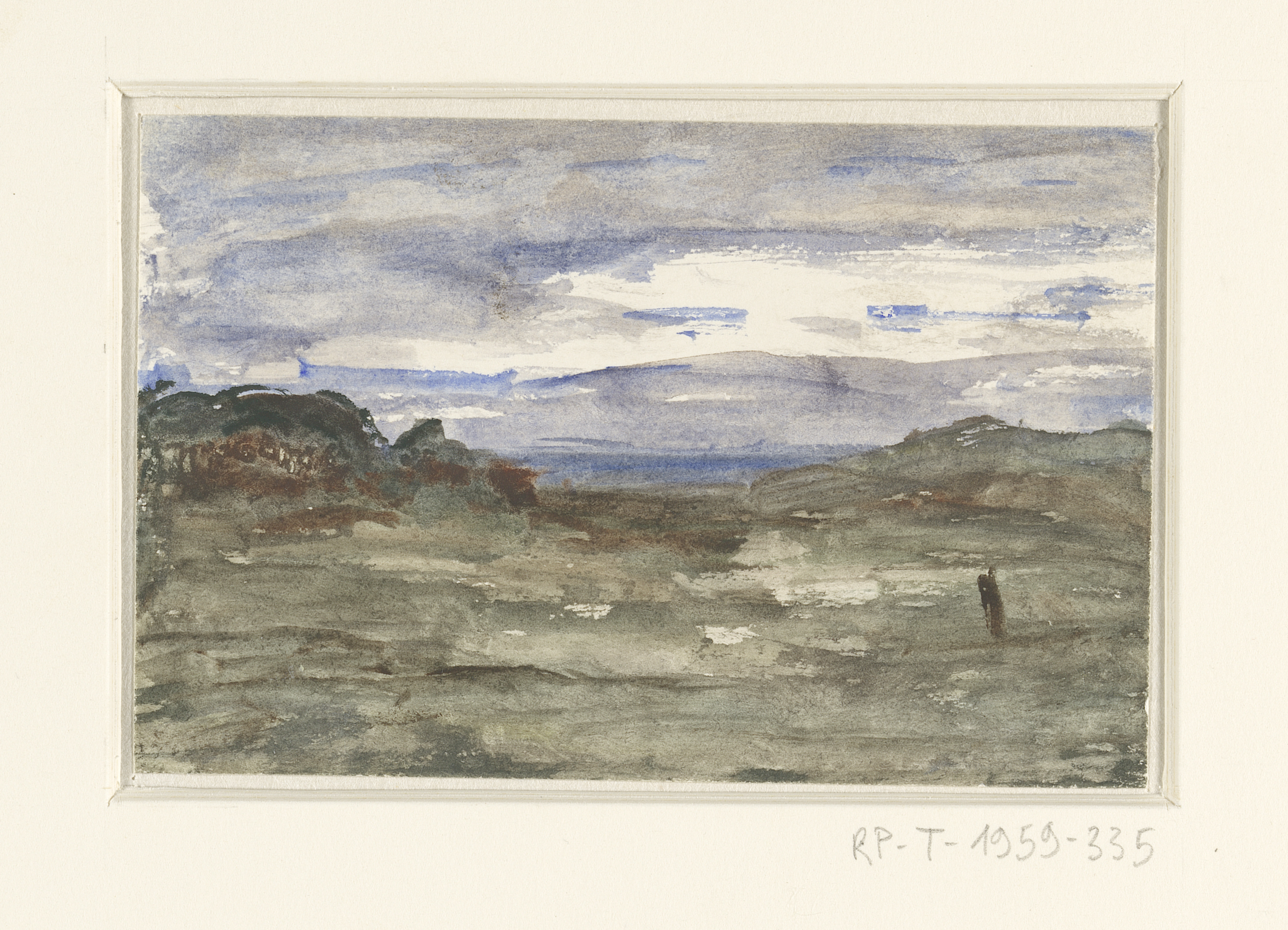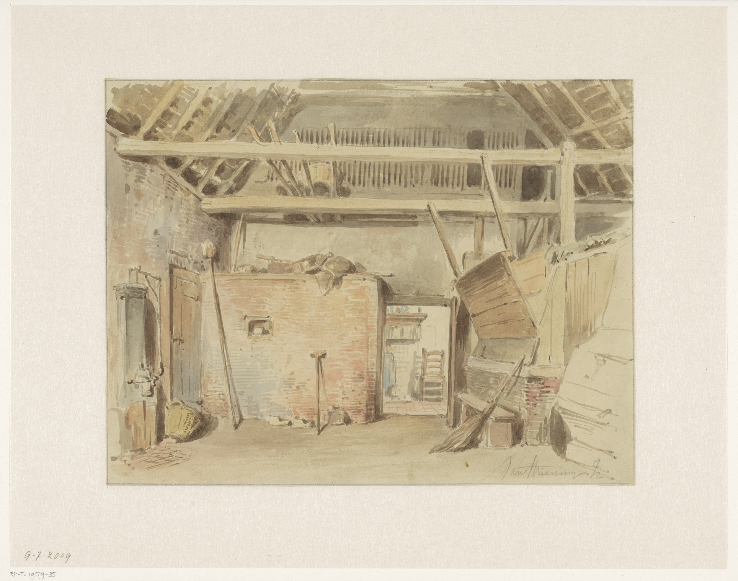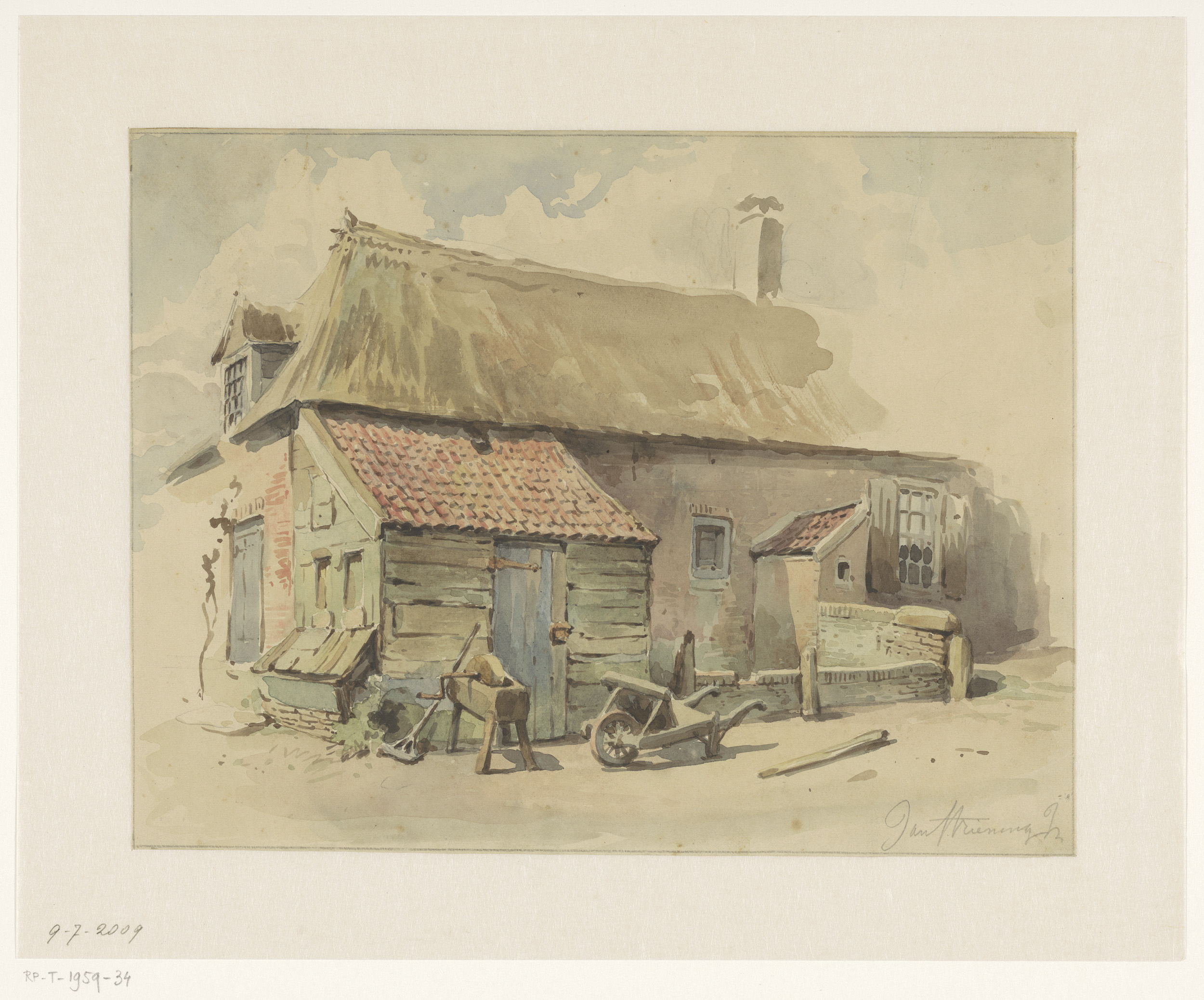 Boerenhuis met houten aanbouw, ervoor een kruiwagen ...