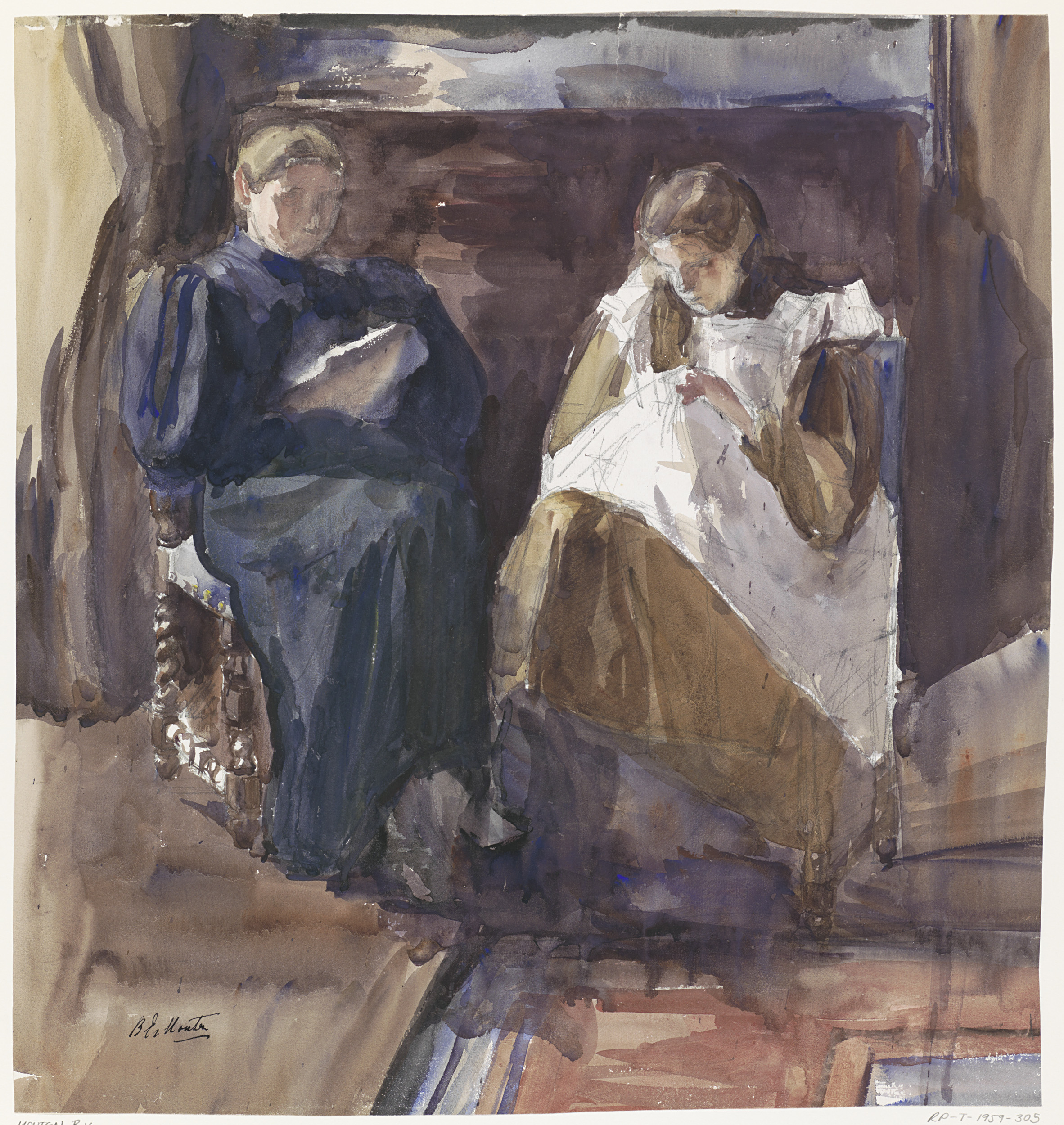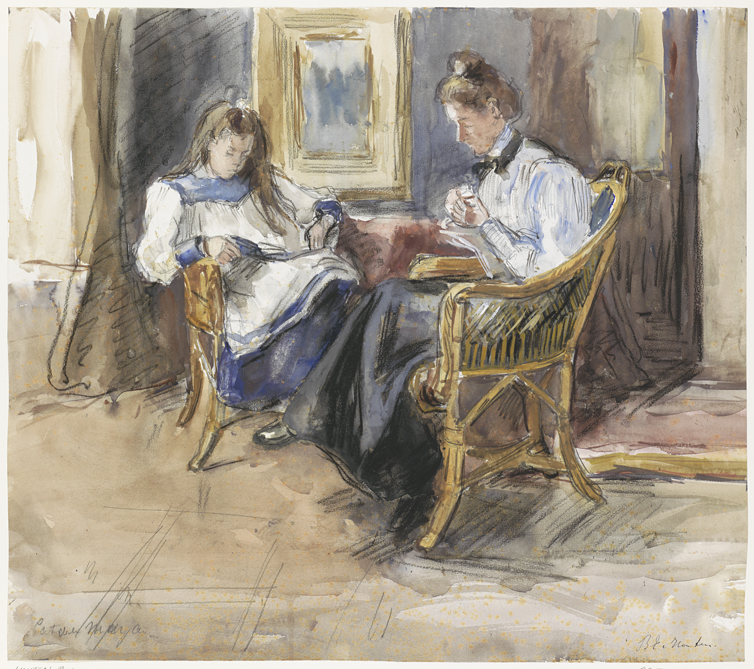 Lezende dame en bordurend meisje, van voren gezien, ...