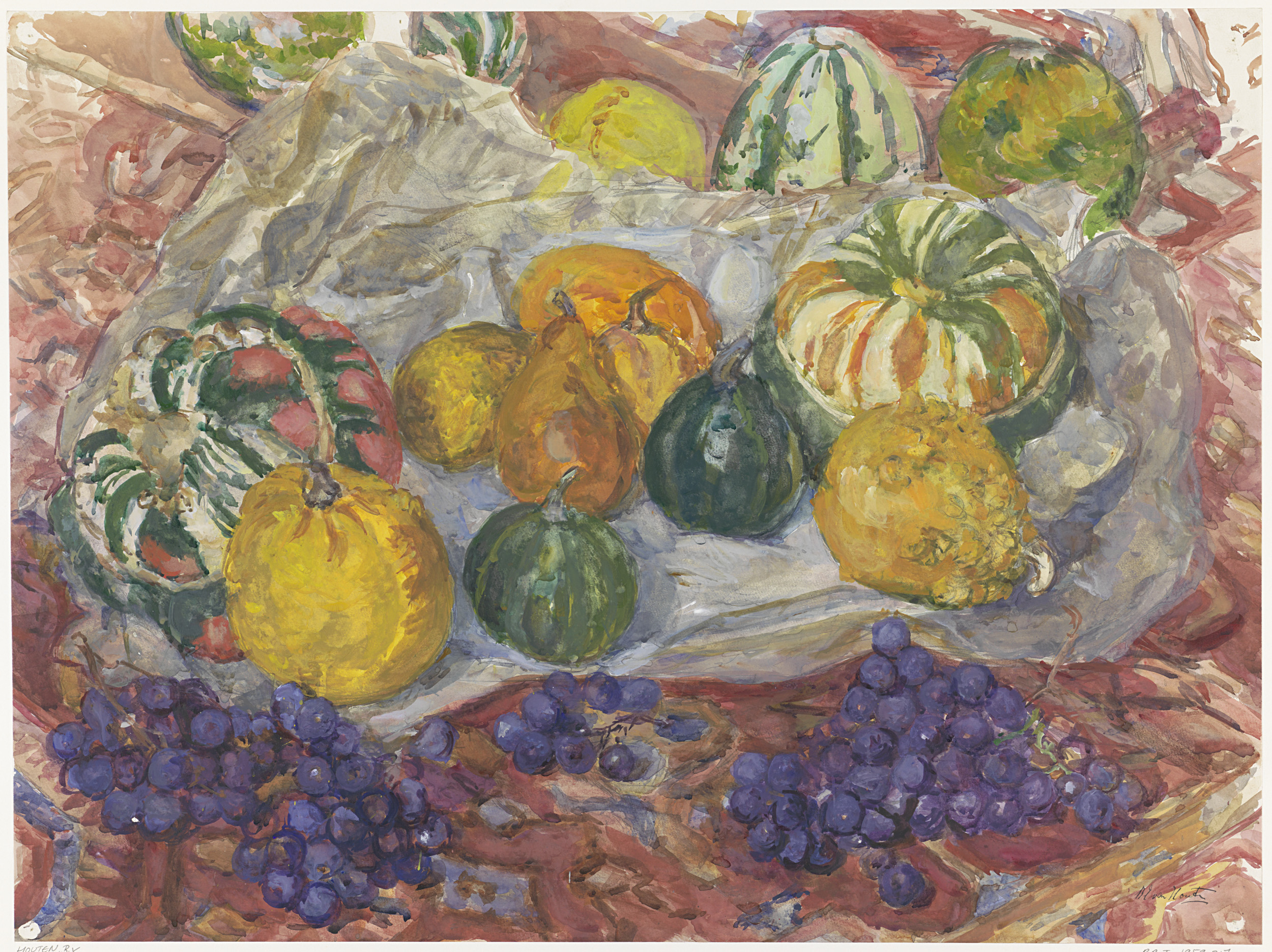 Stilleven van pompoenen en druiven op een kleed