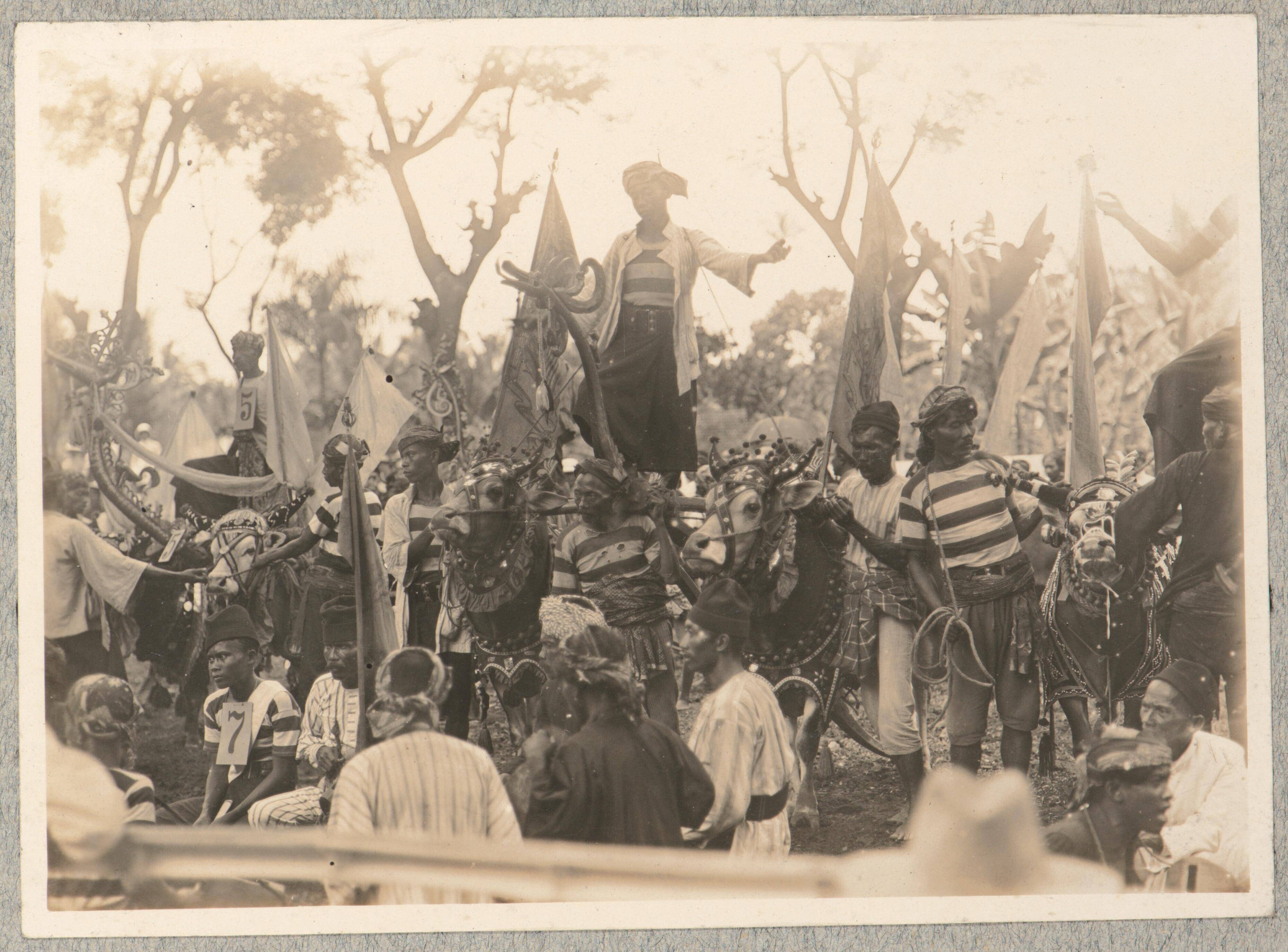 Groep mensen en versierde runderen tijdens een cerem...