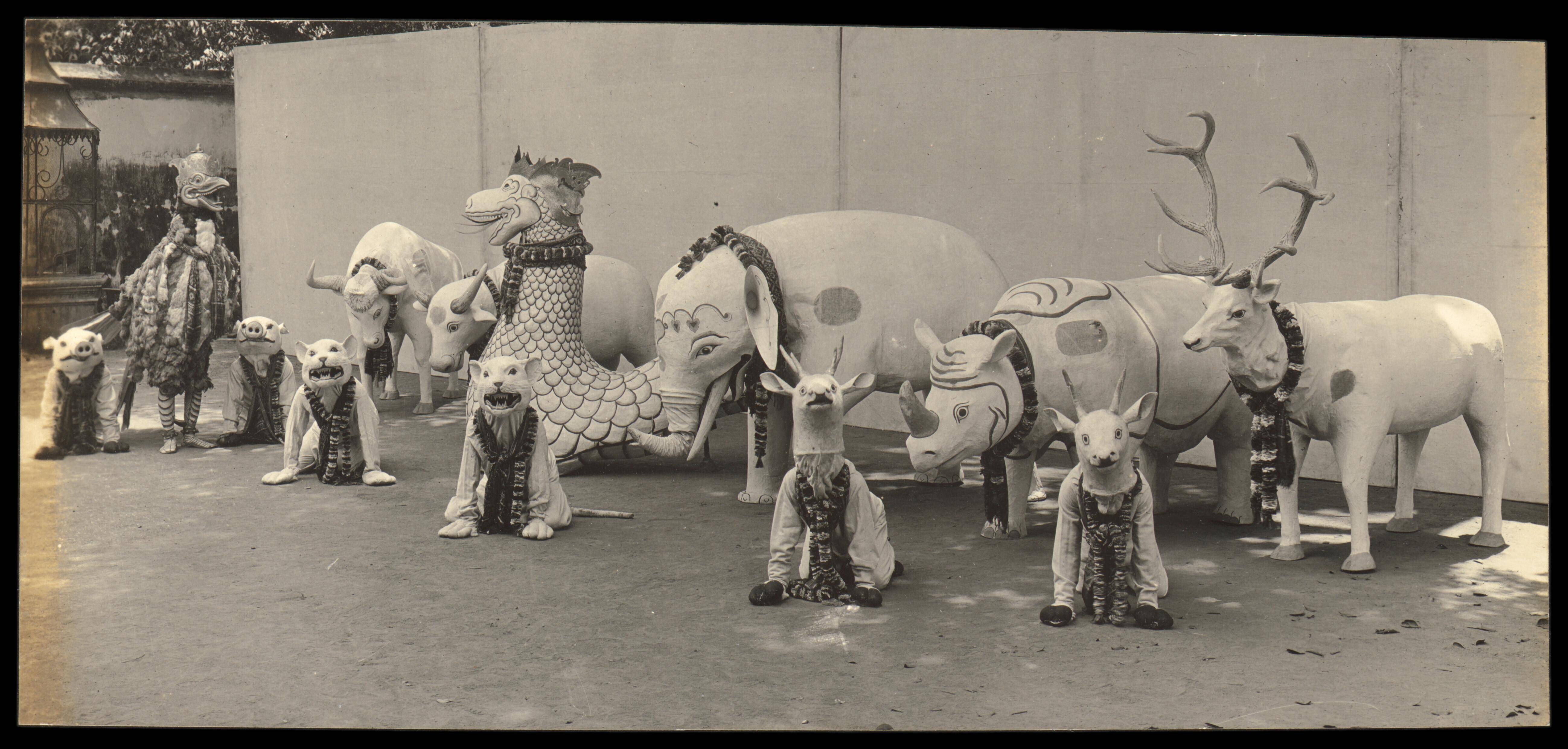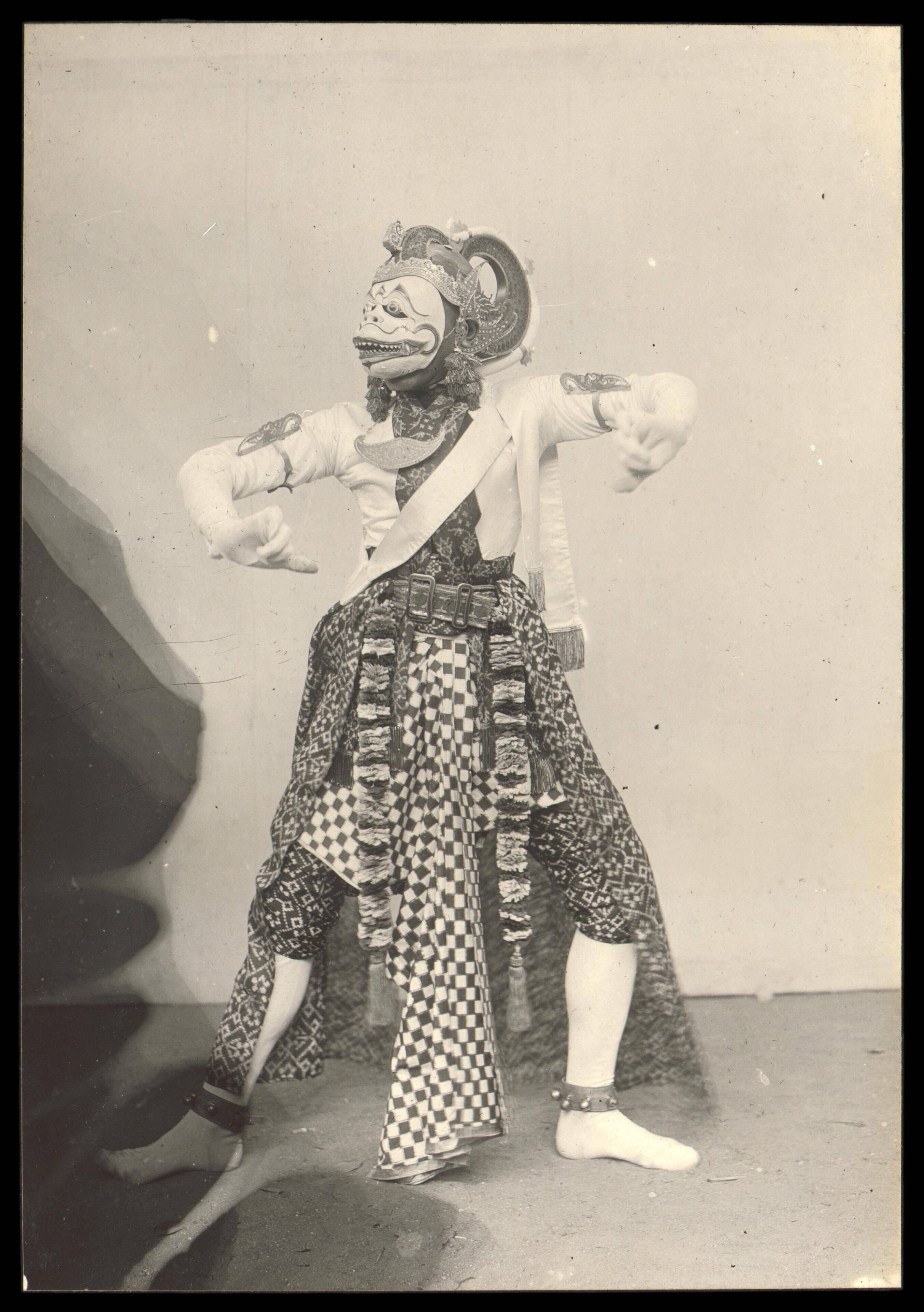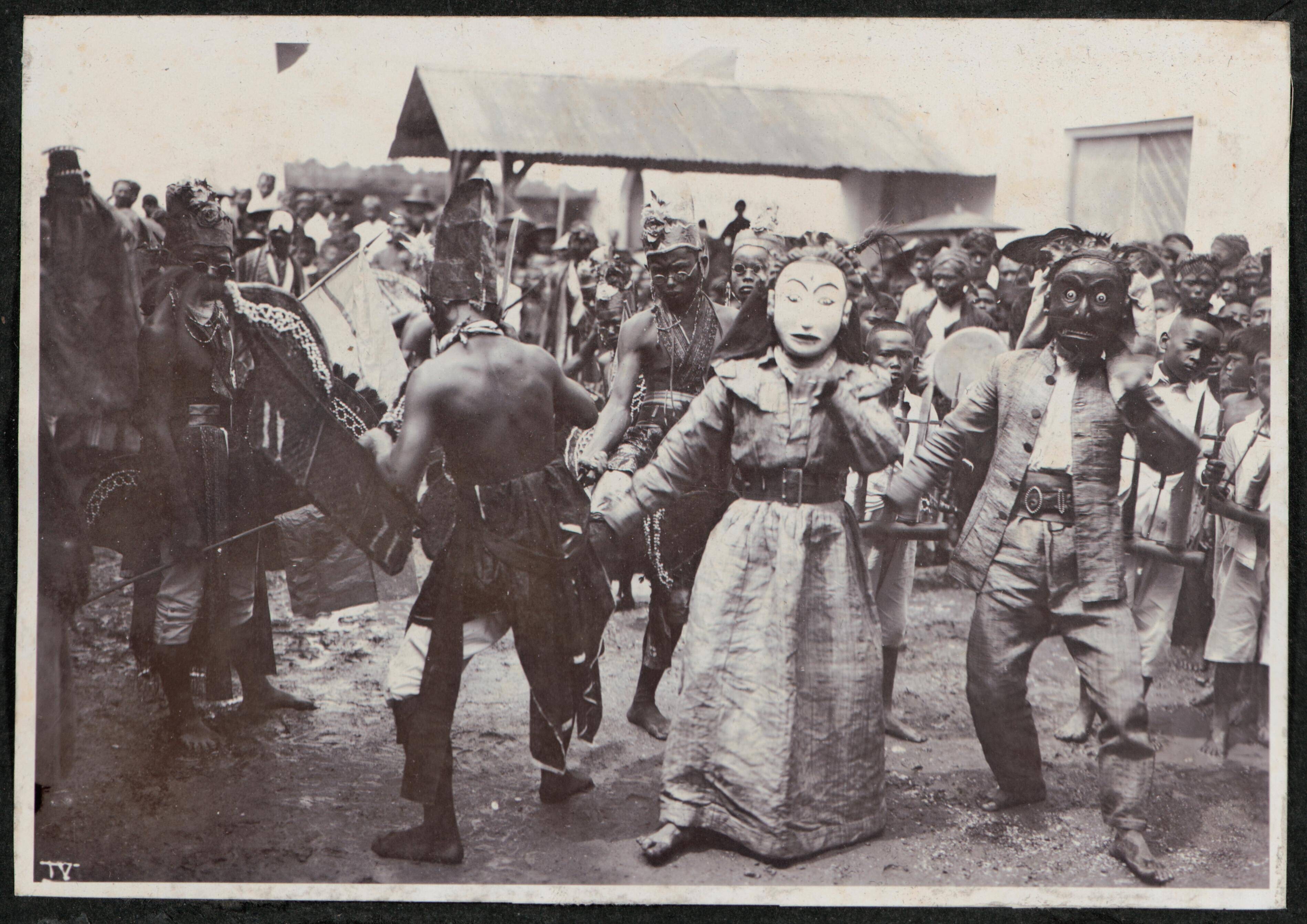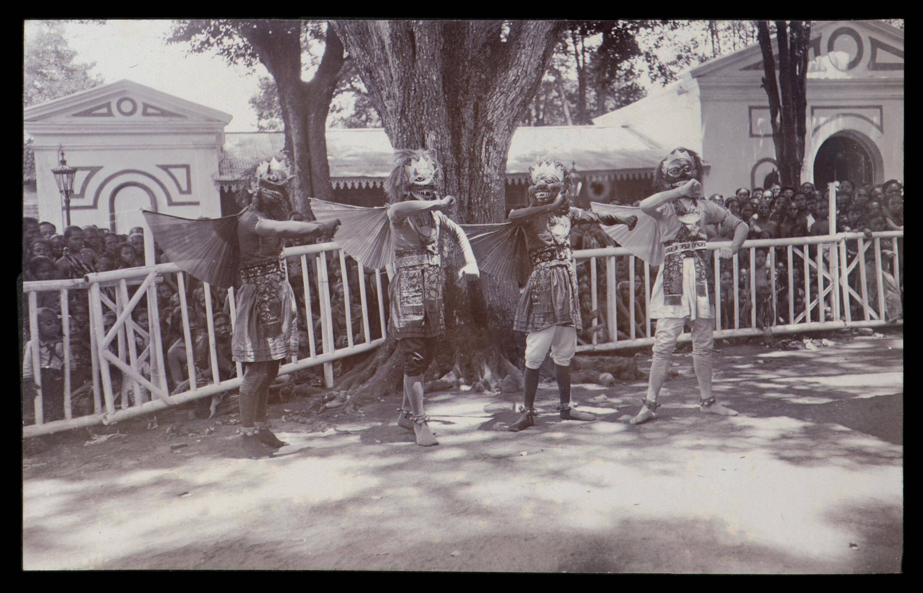 Twee beelden van gemaskerde dansers ter weerszijde v...