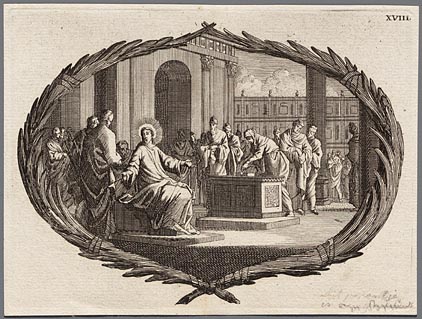 Jezus wijst de omstanders op de offerkist waarin de ...