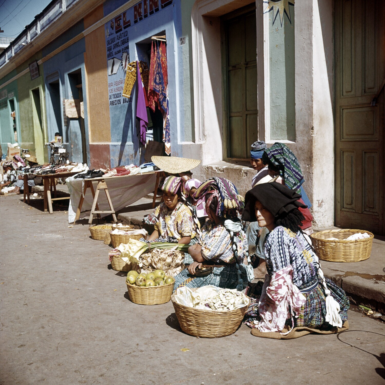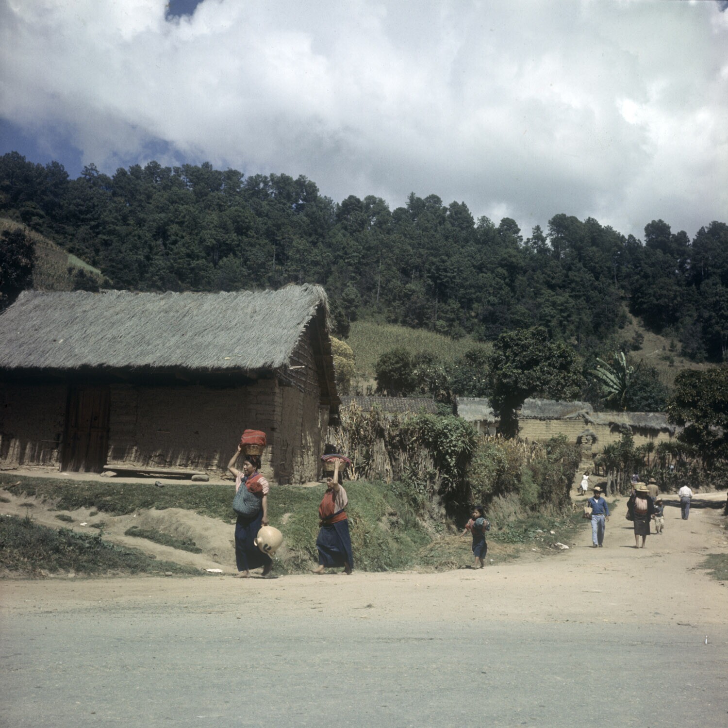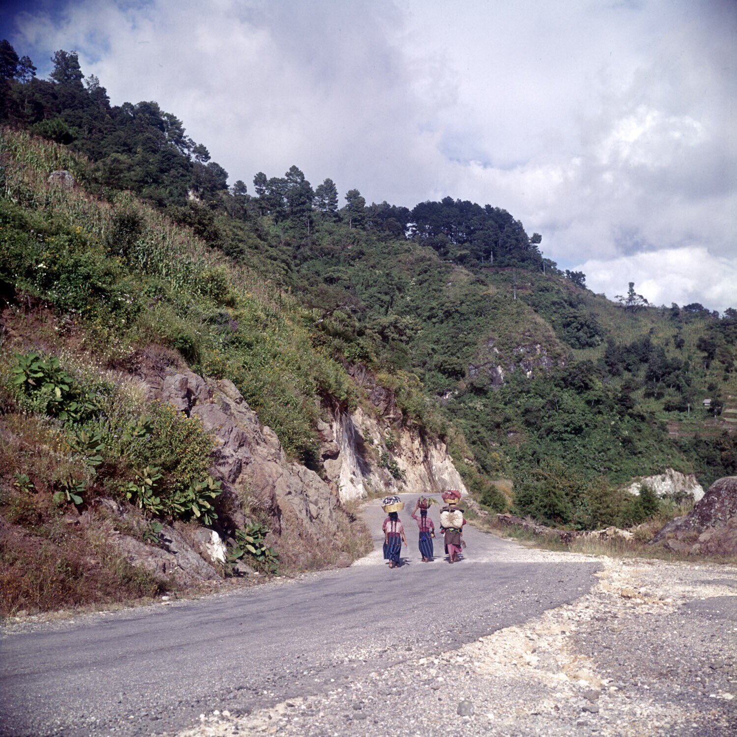 3 vrouwen met manden op het hoofd die op de PanAmeri...