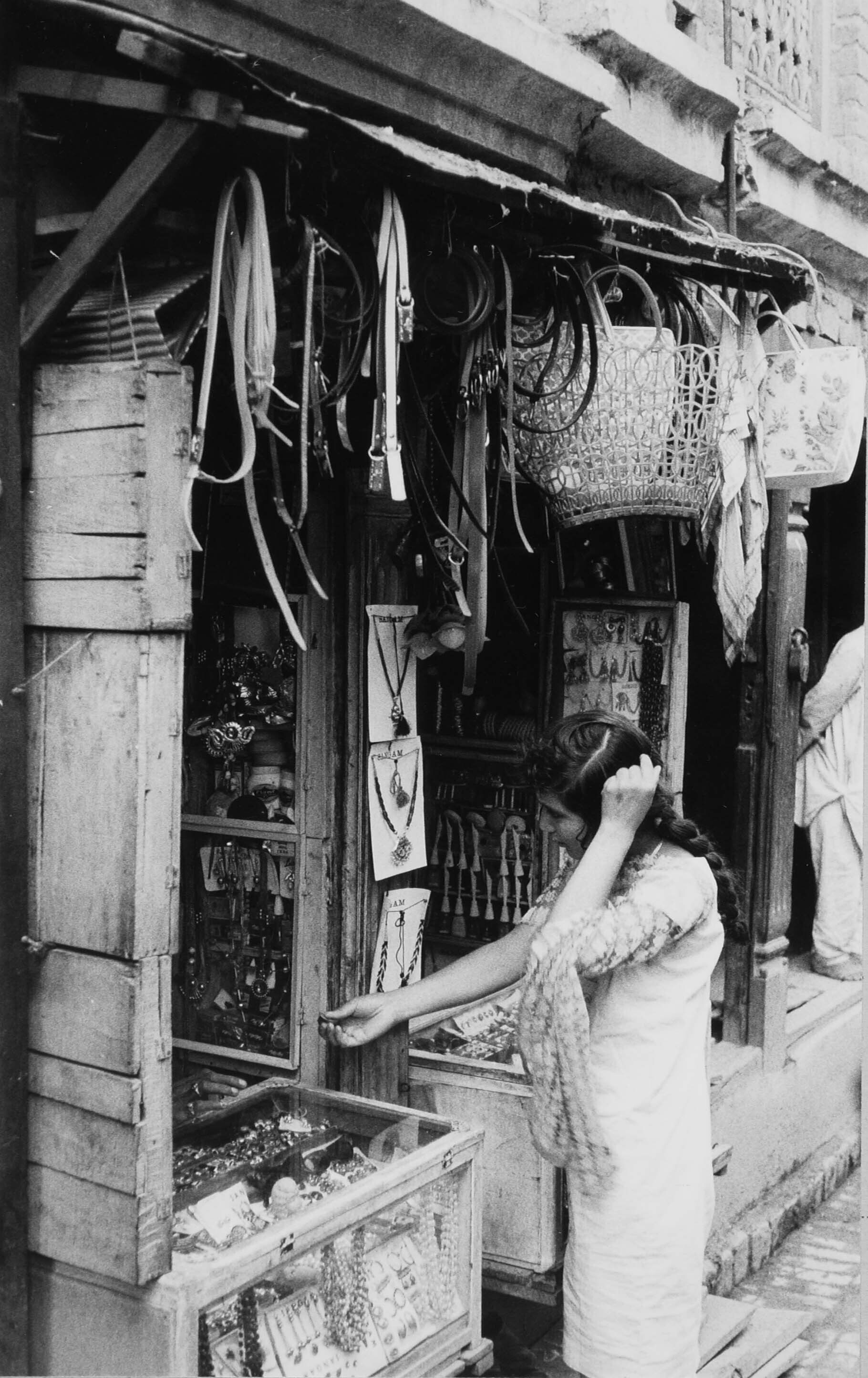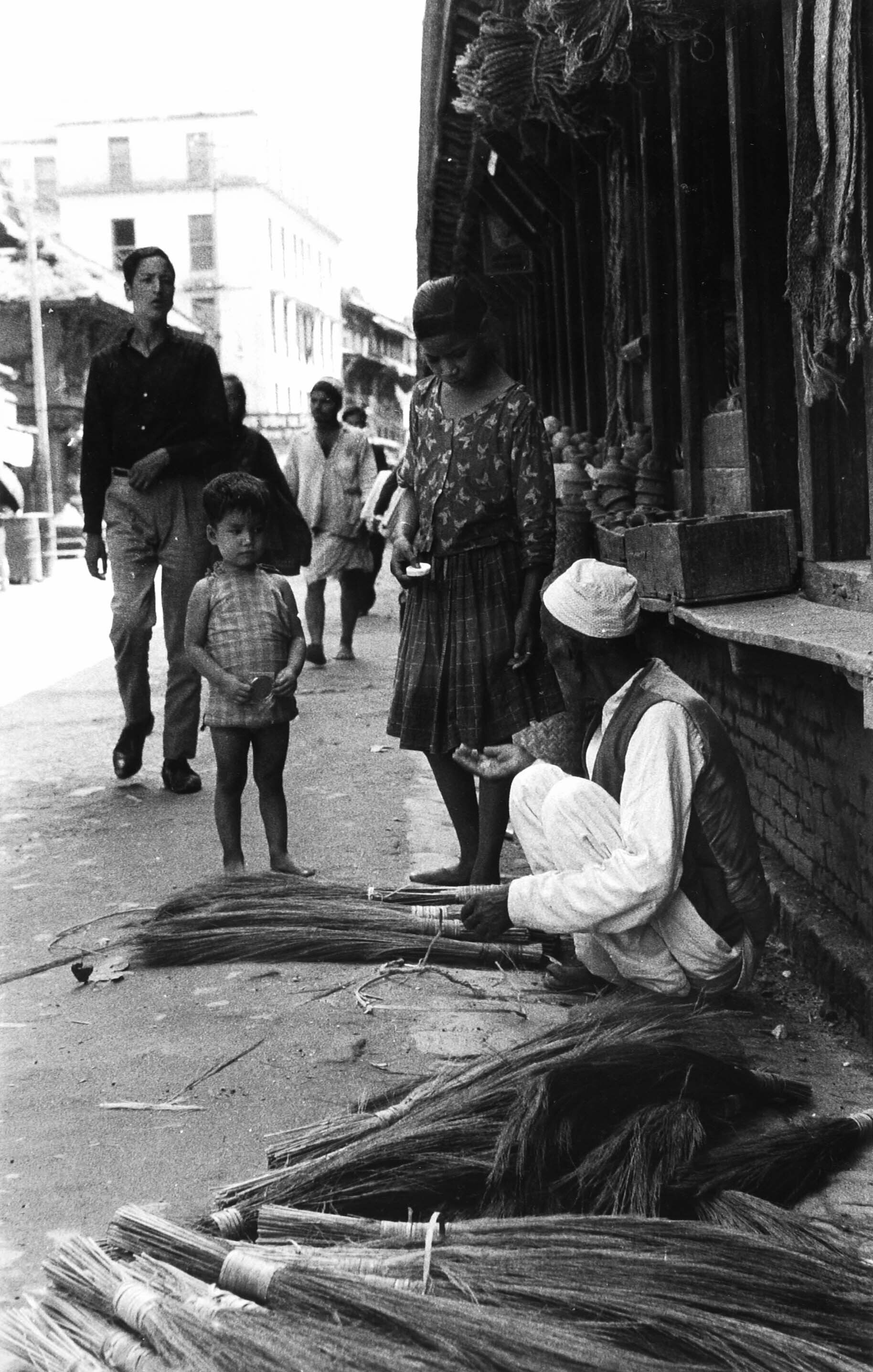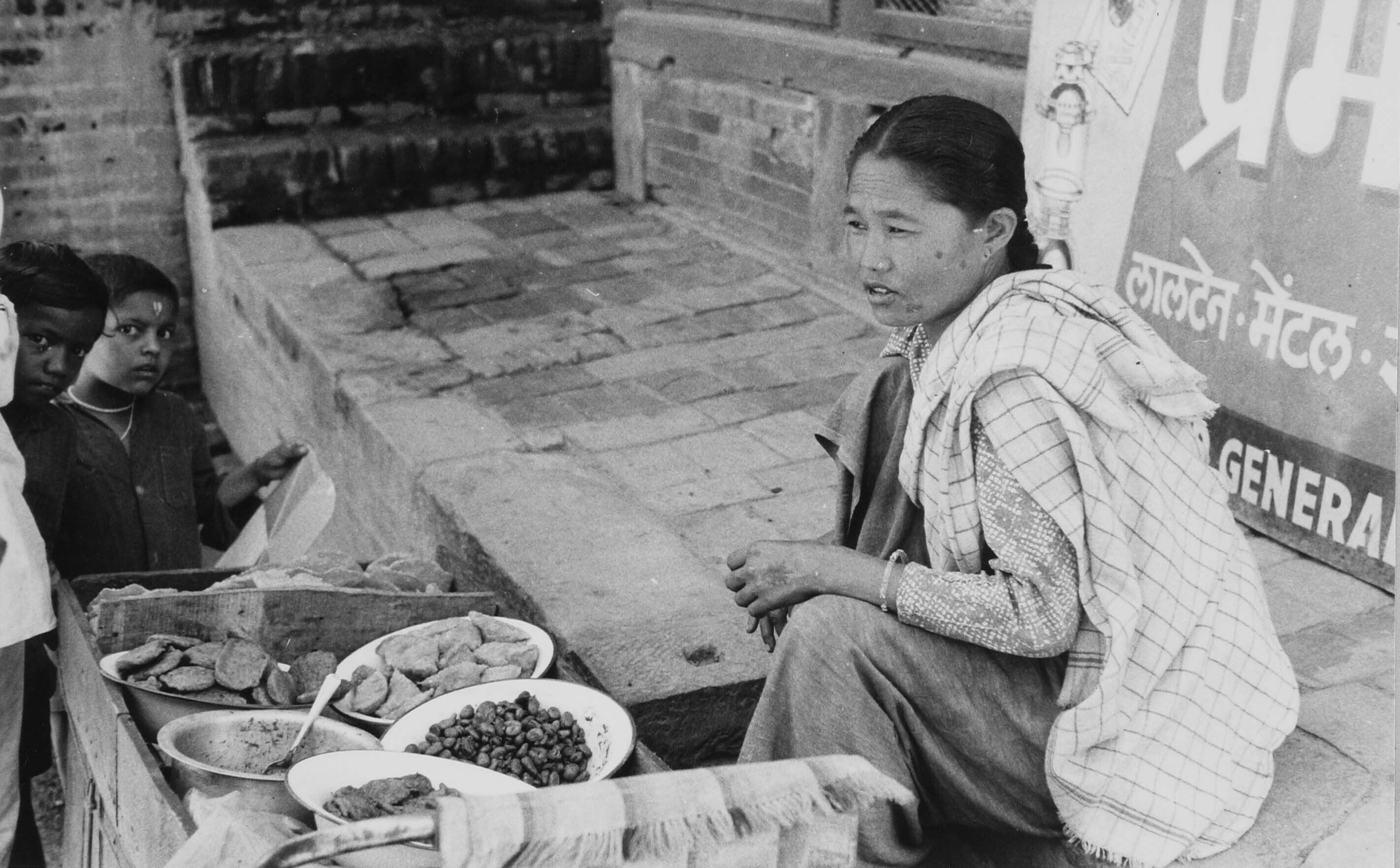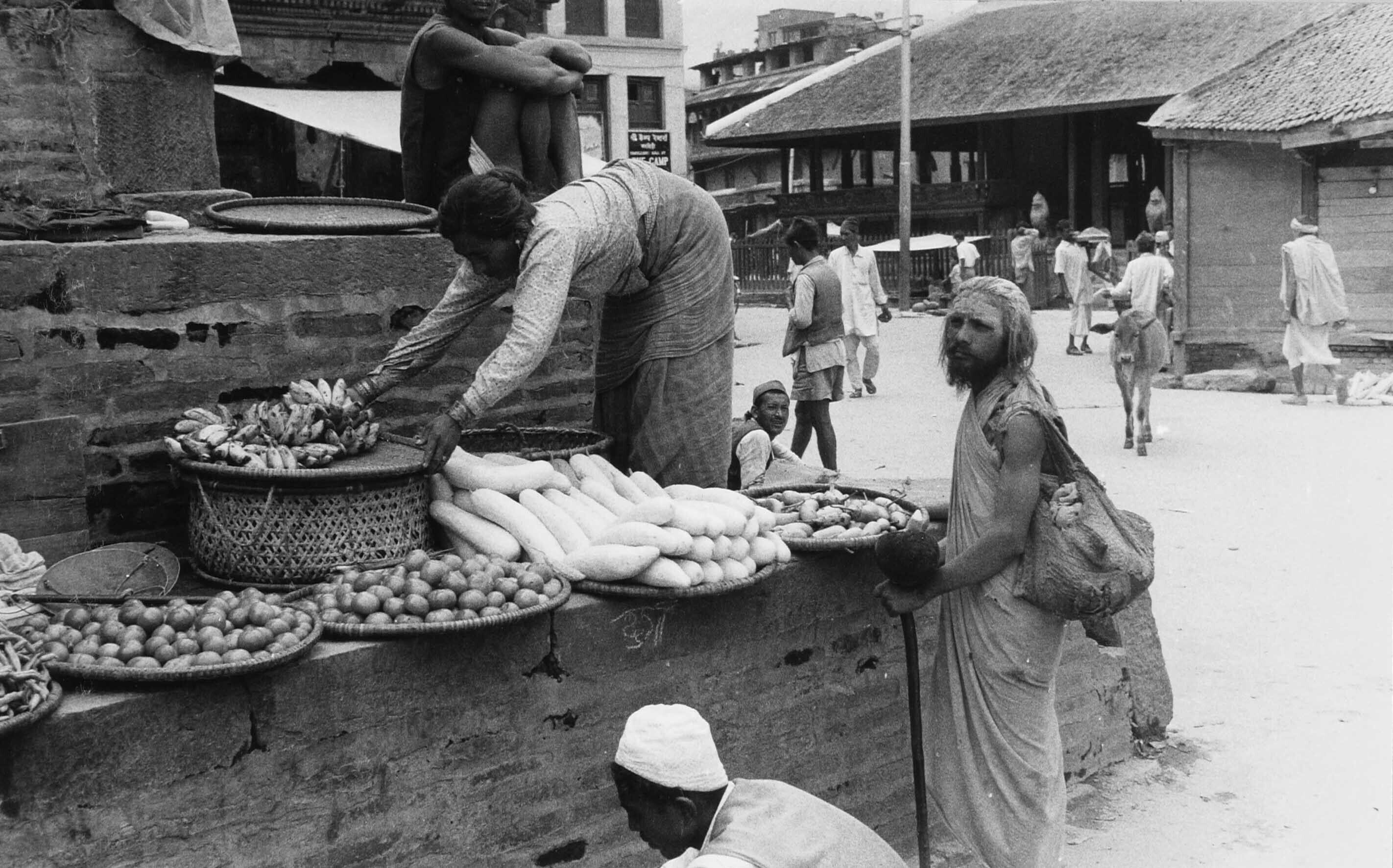 Groenteverkoopster en bedelaar aan de voet van een p...