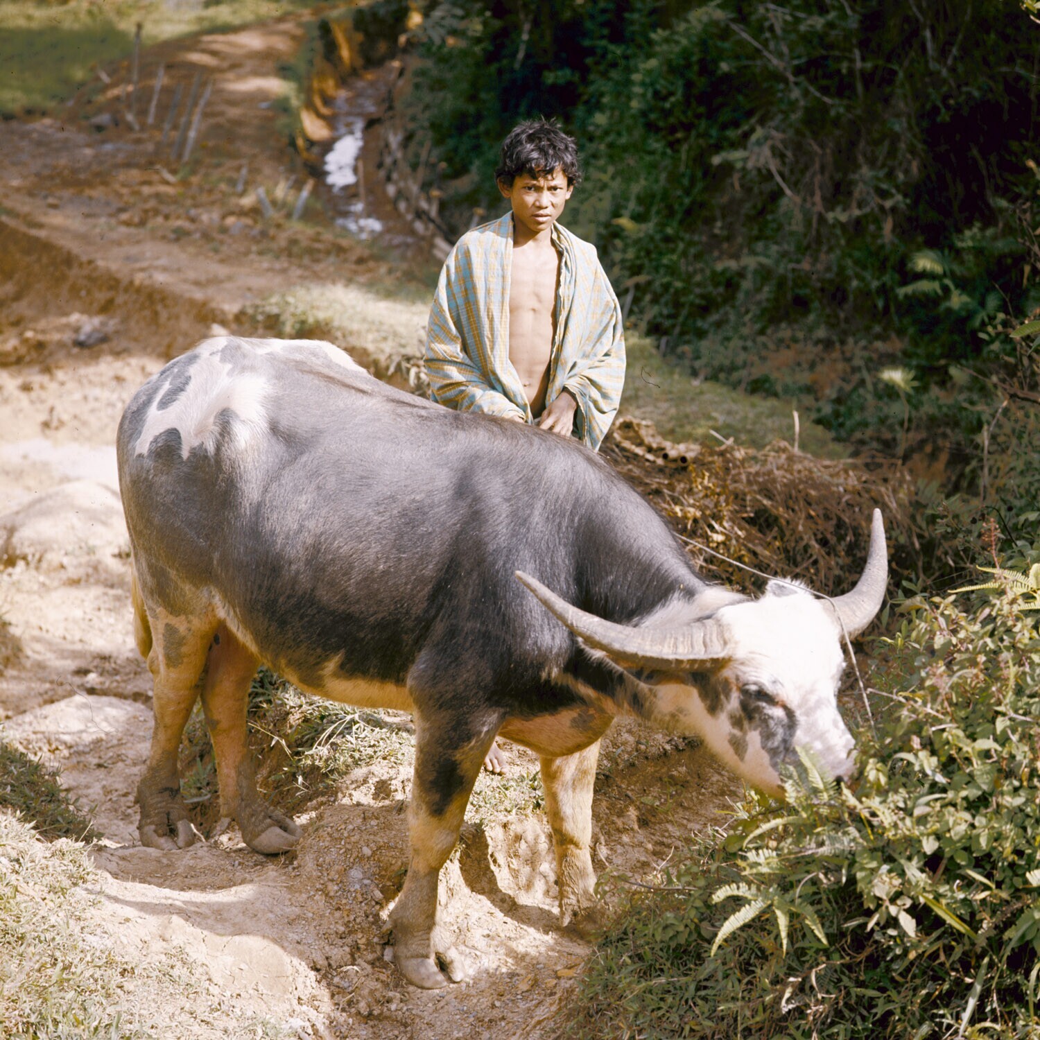 Jongen met een karbouw-belang. Deze karbouw heeft in...