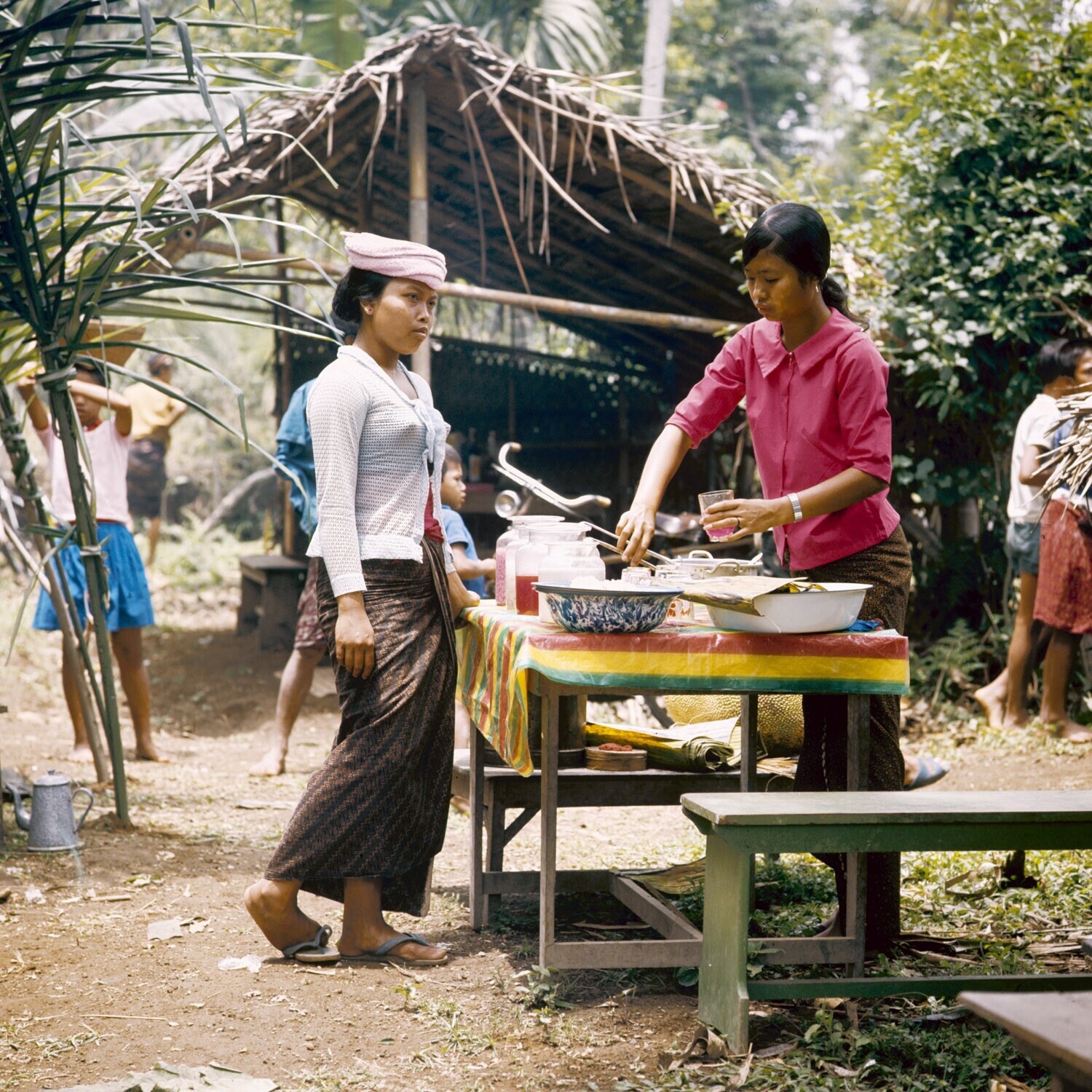 Vrouwen met offerandes bij een begrafenis, Bali