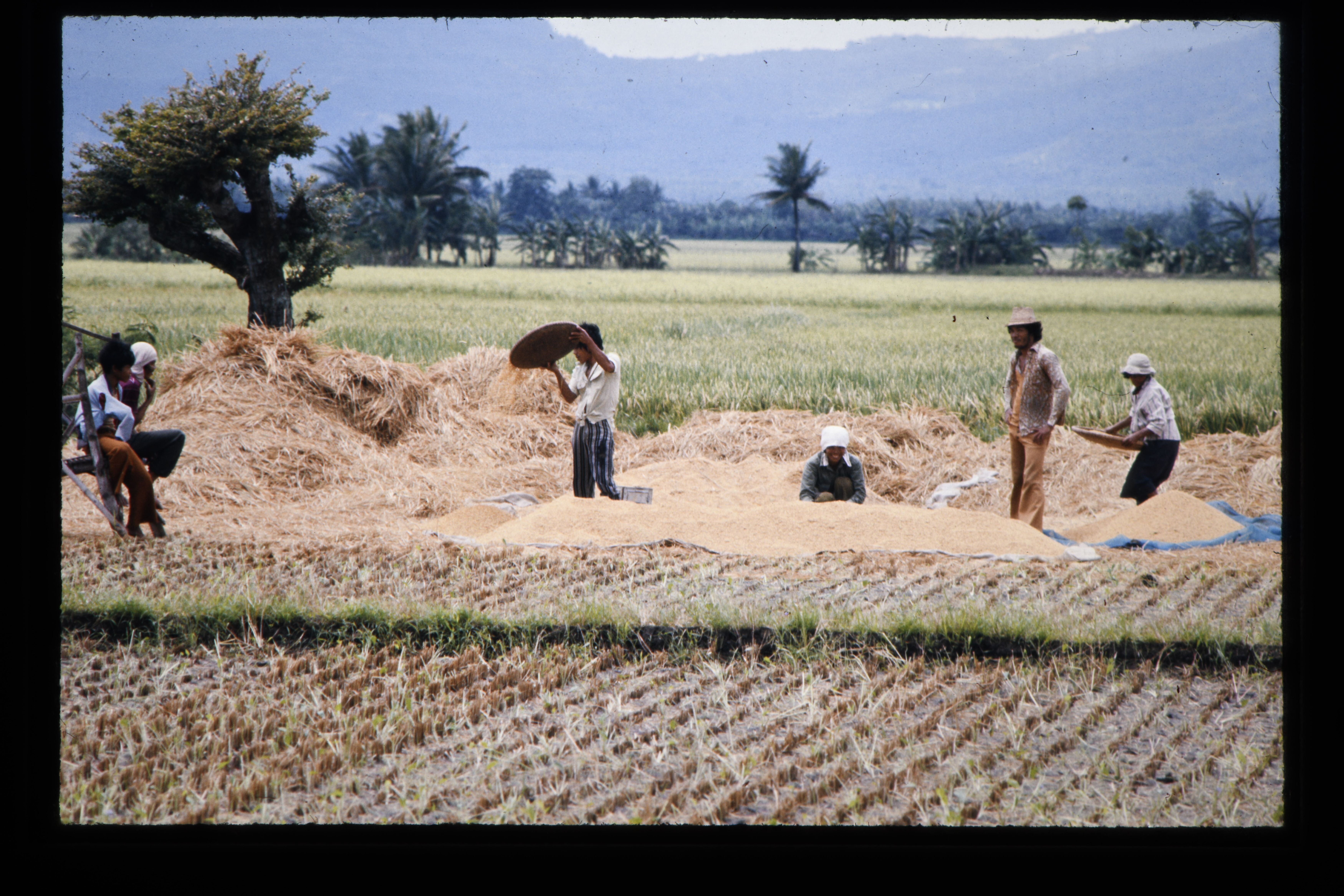 'Dorsende boeren op rijstvelden bij Los Baños'