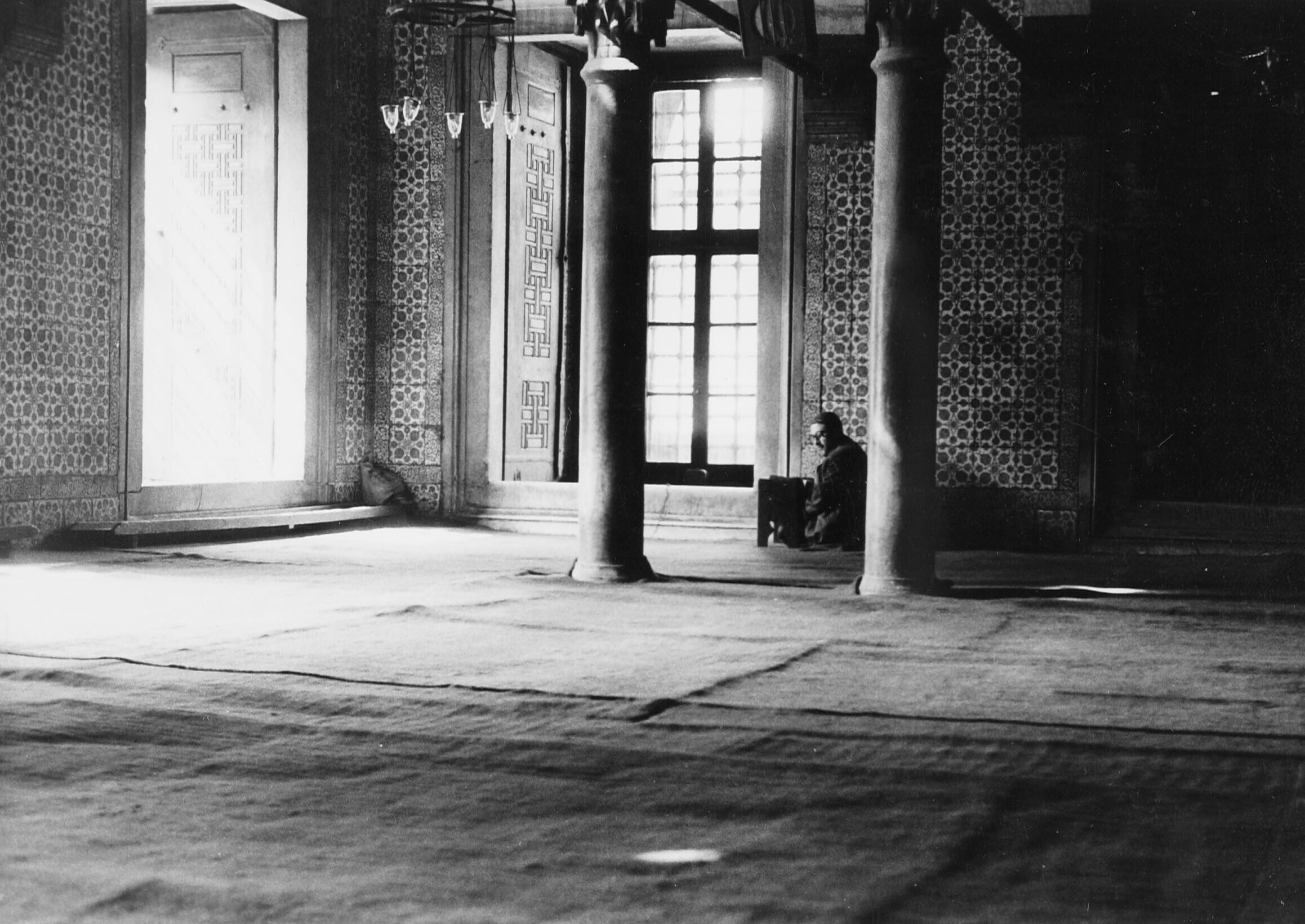 Interieur van een moskee, een man in gebed