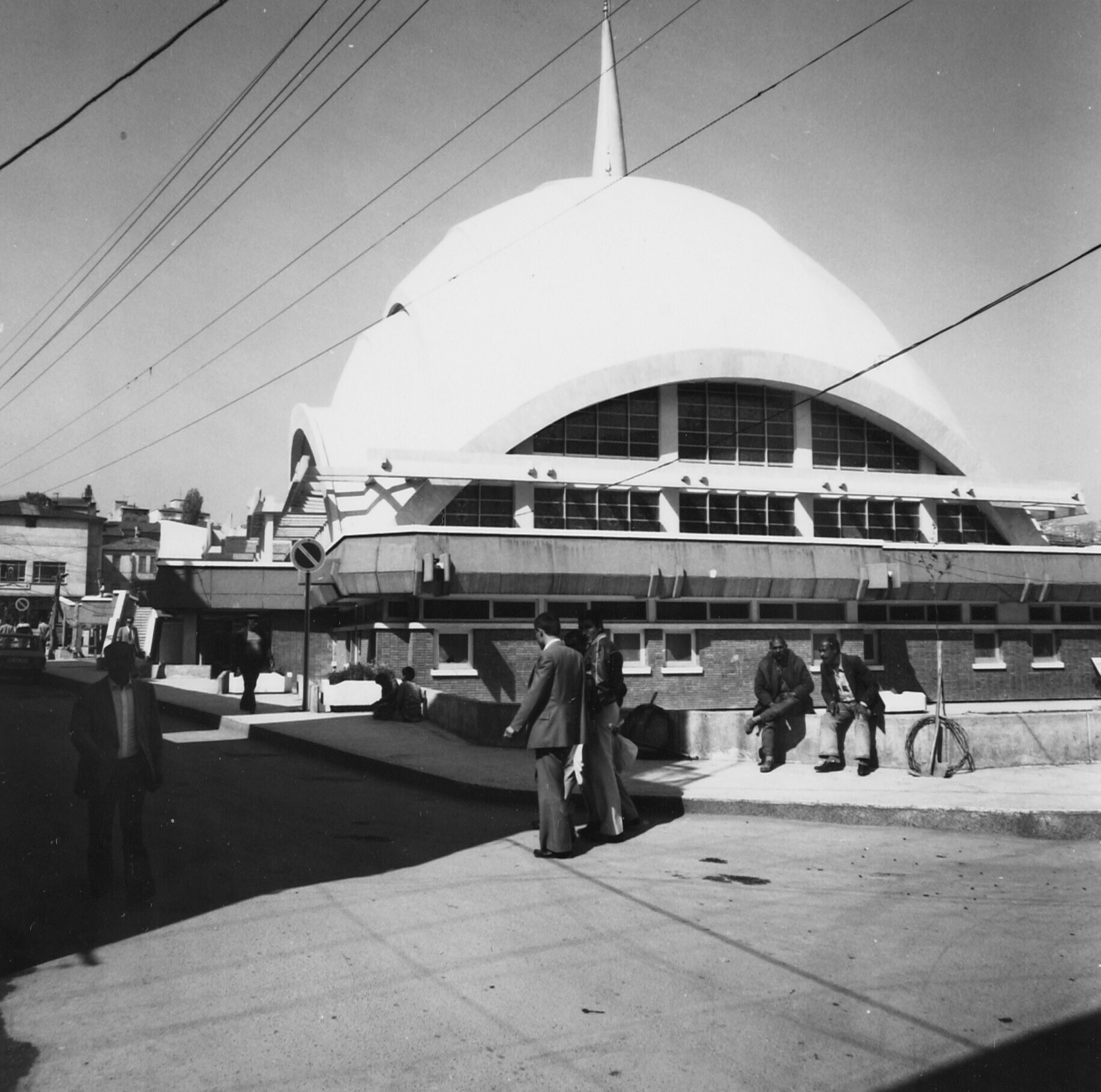 De moderne moskee met daaronder een winkelgalerij