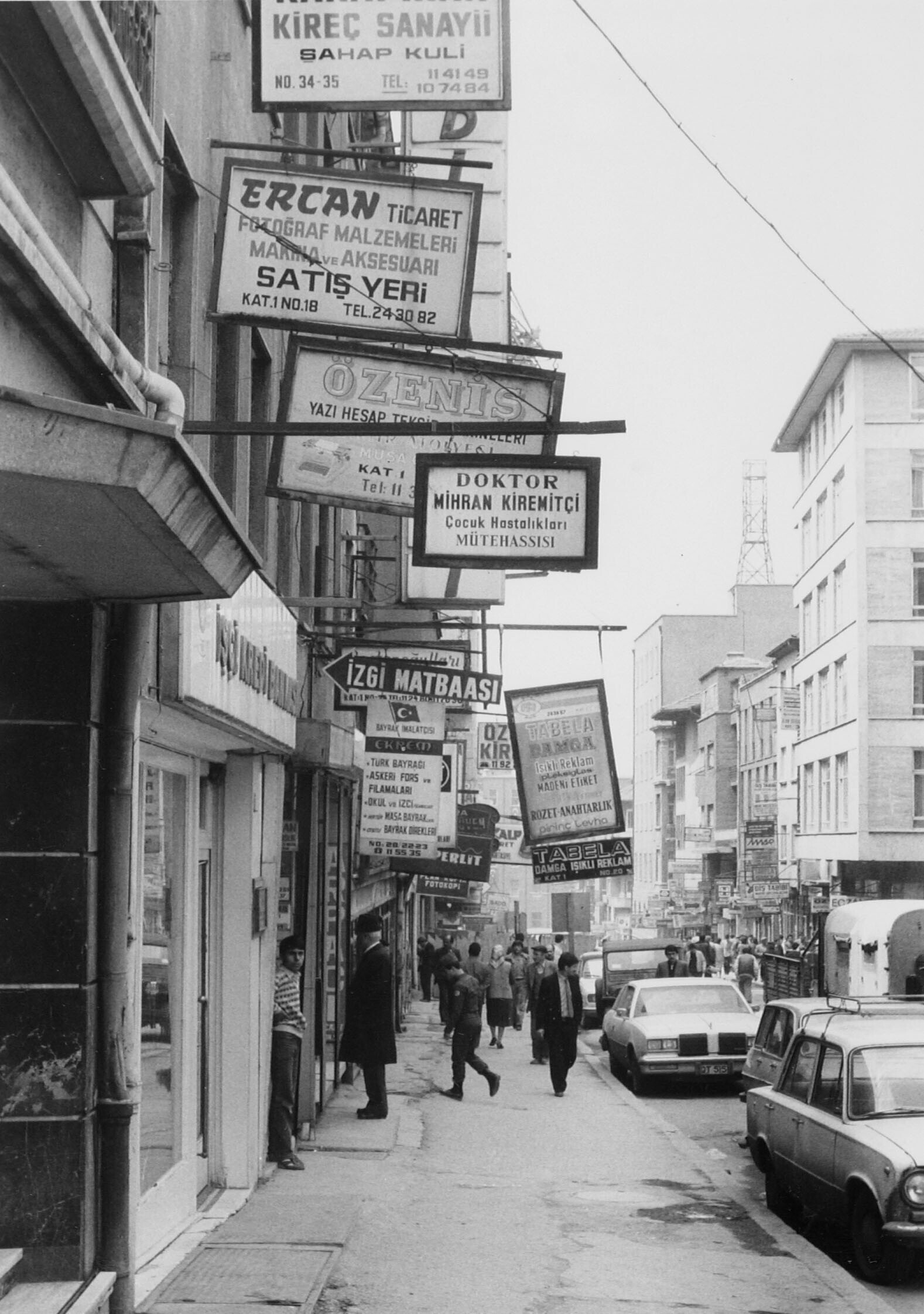 Een winkelstraat met uithangborden