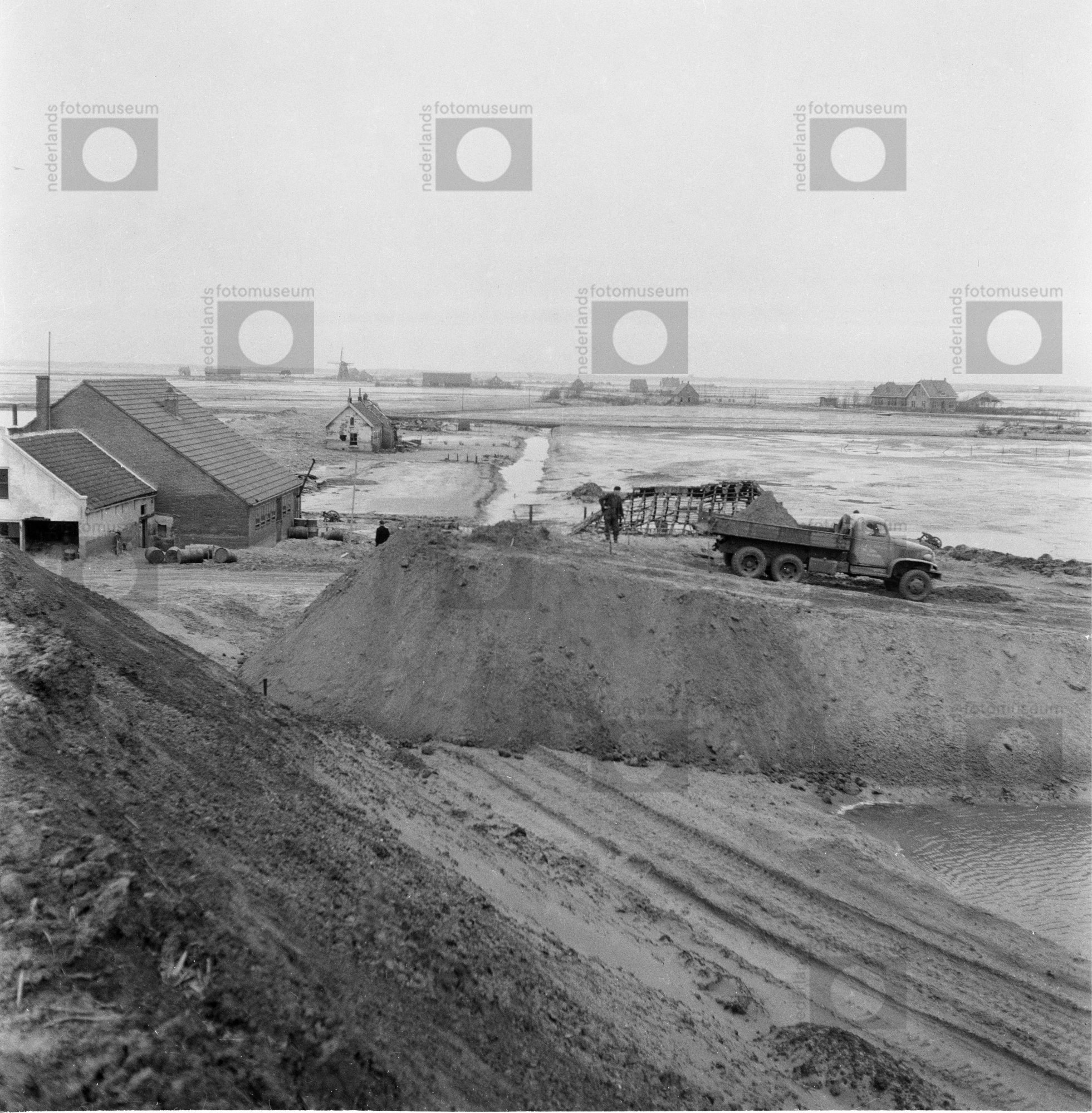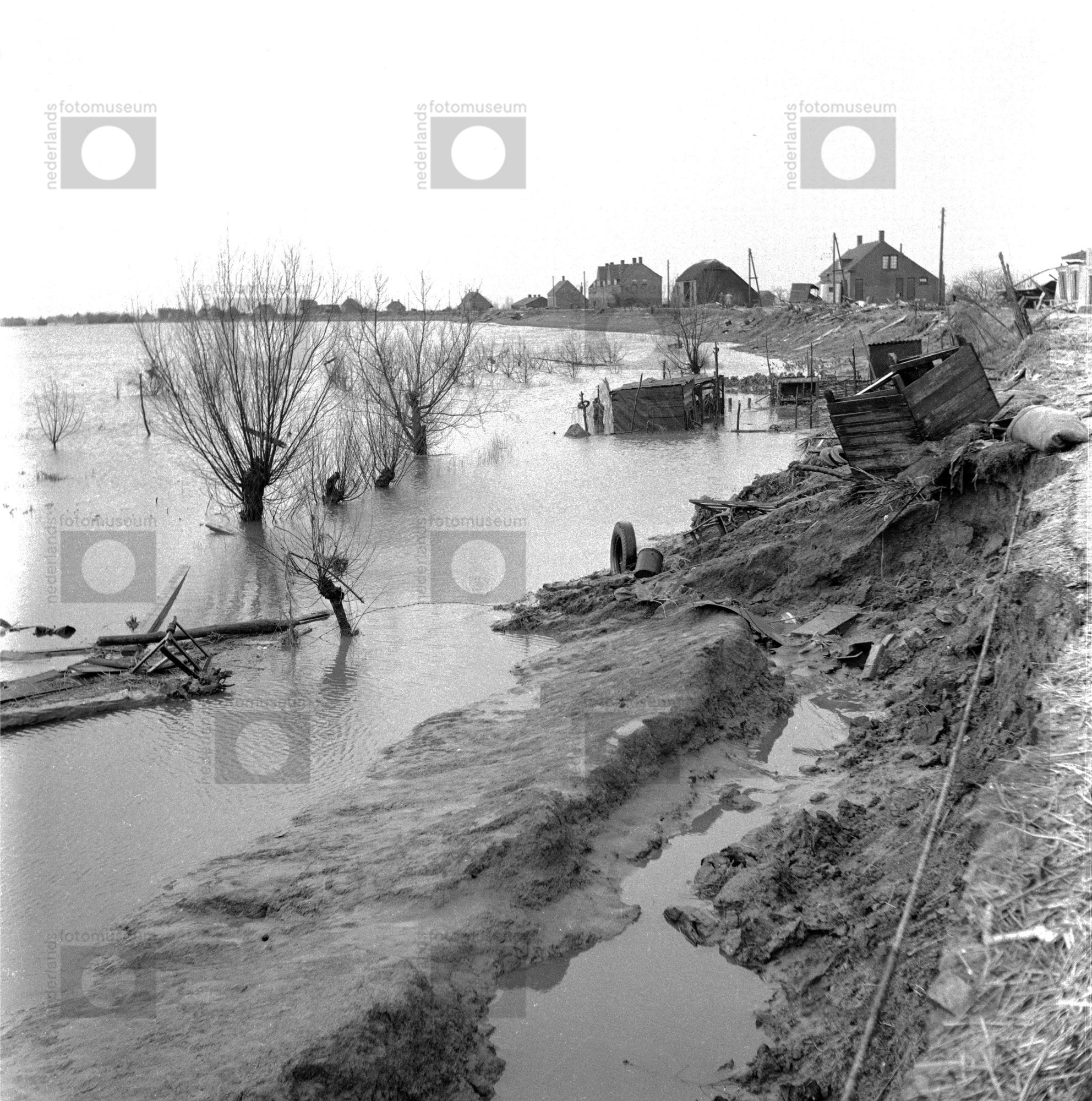 Puin en huisraad op een dijk, Watersnoodramp, Zeelan...